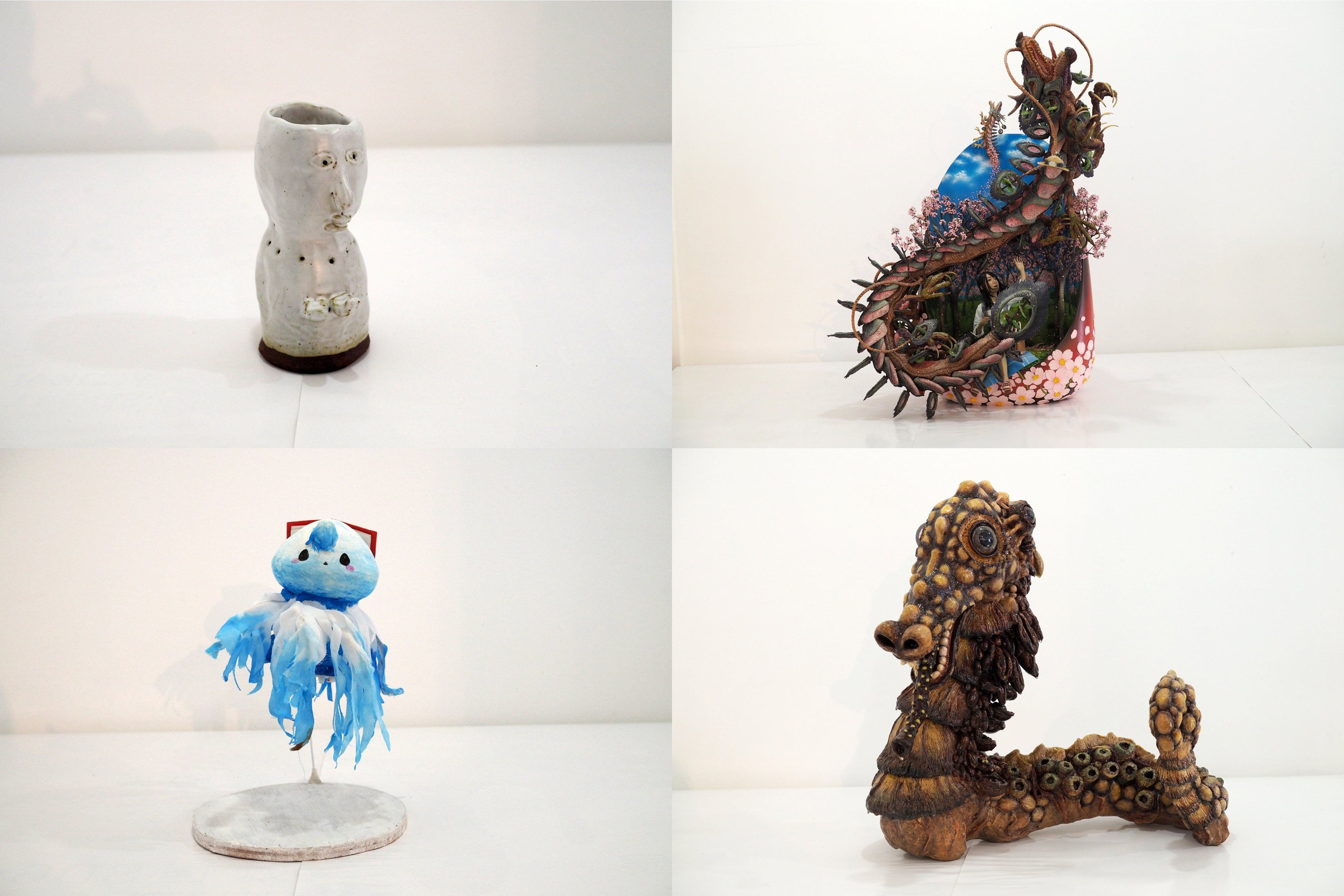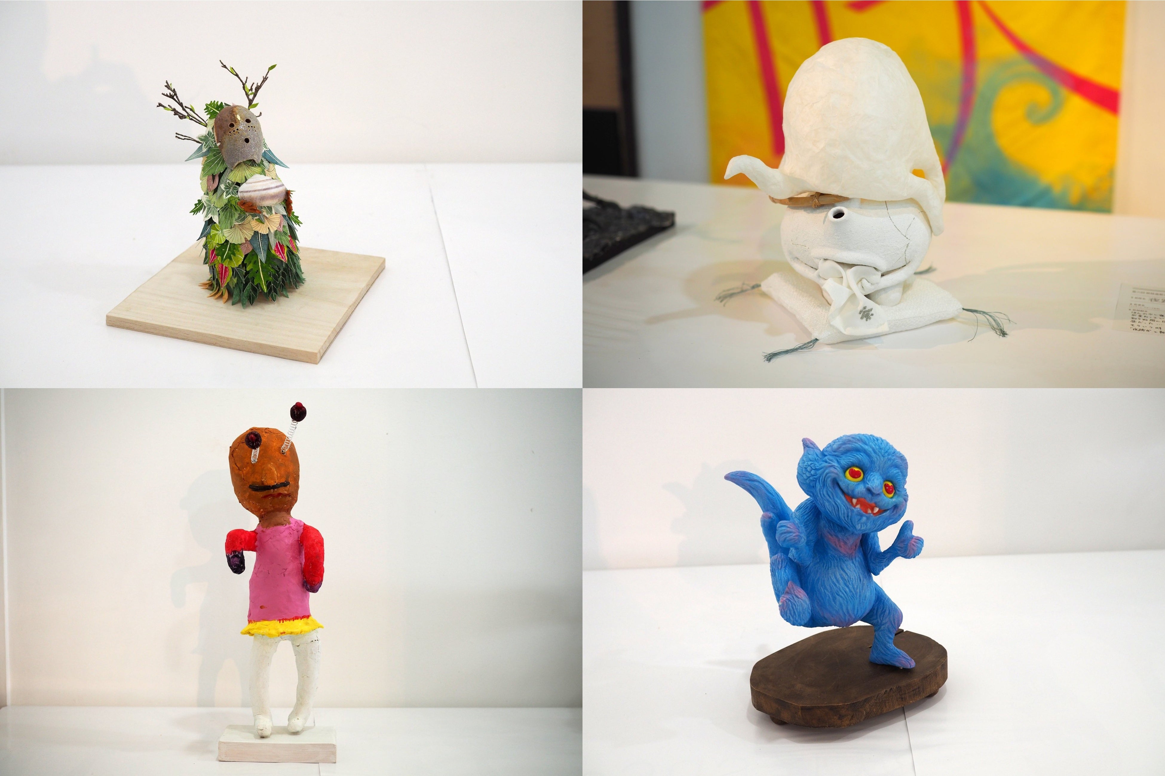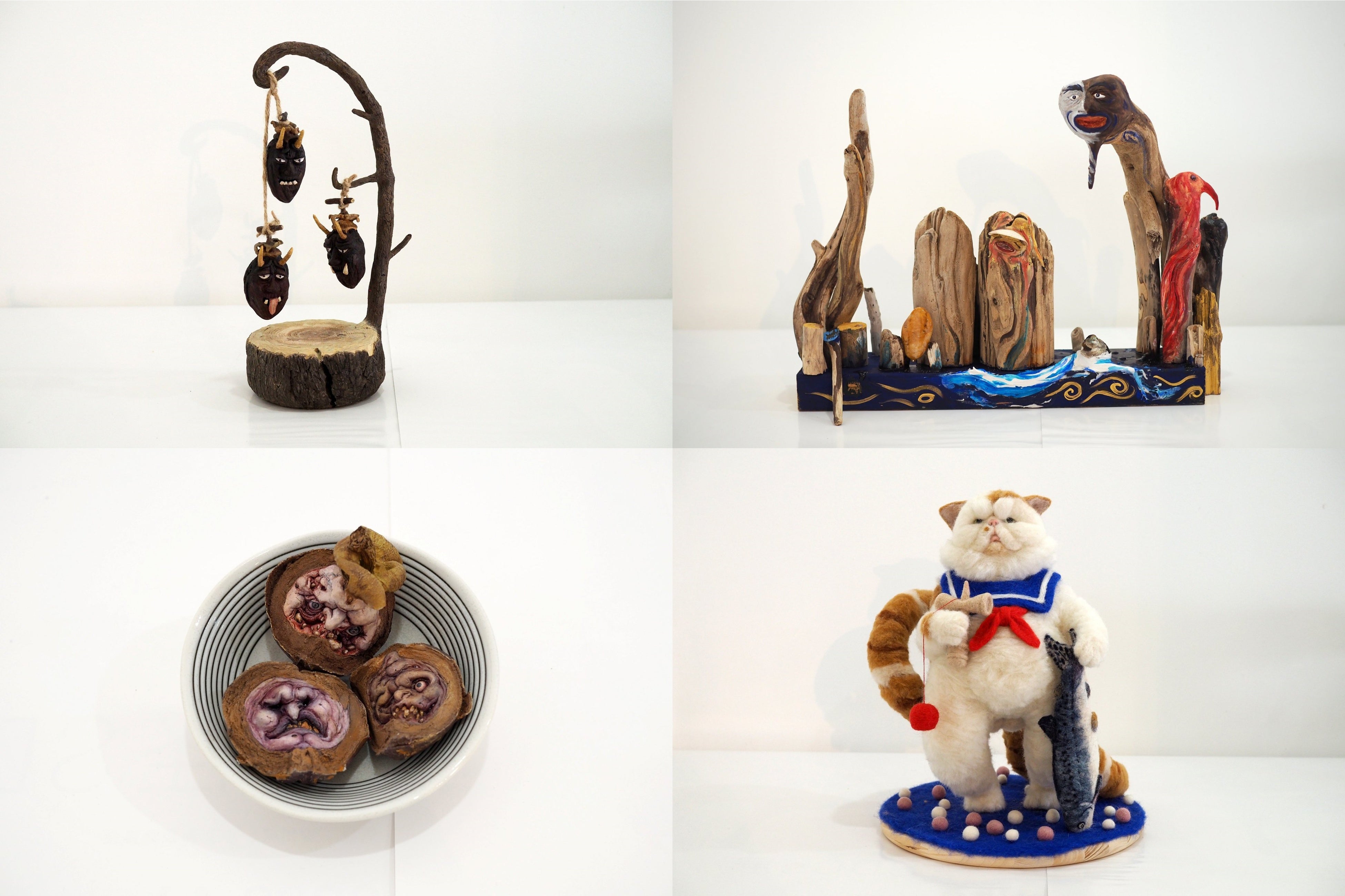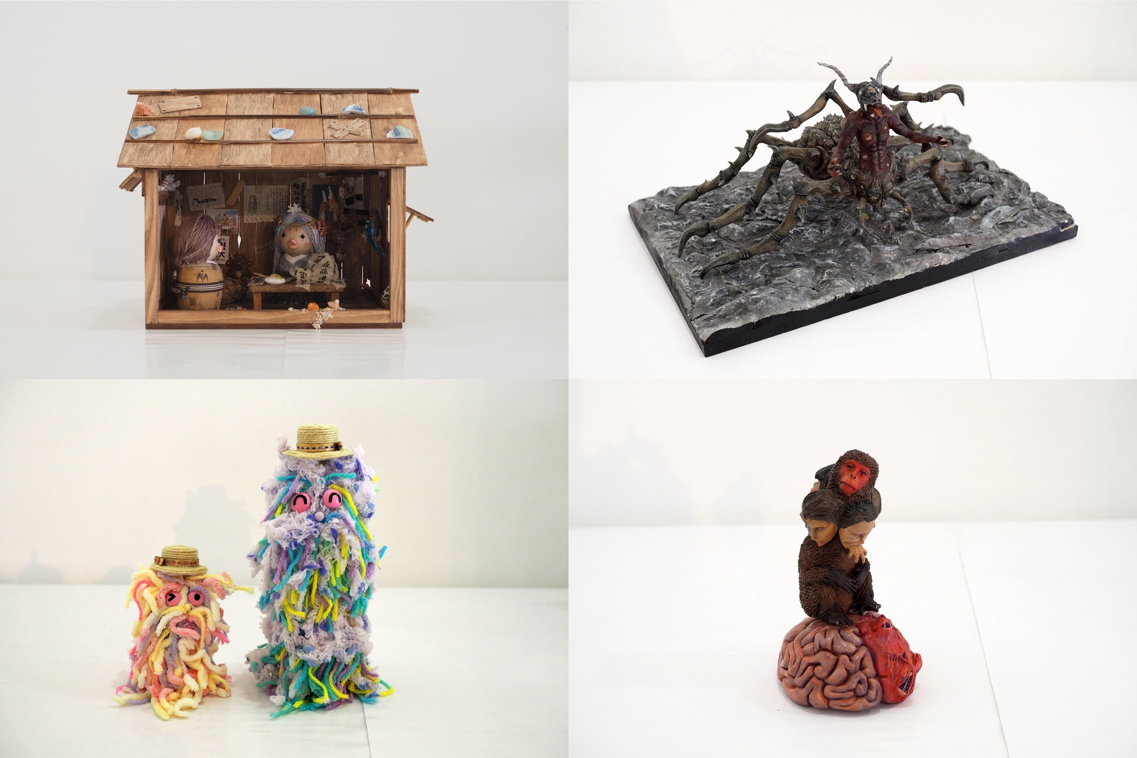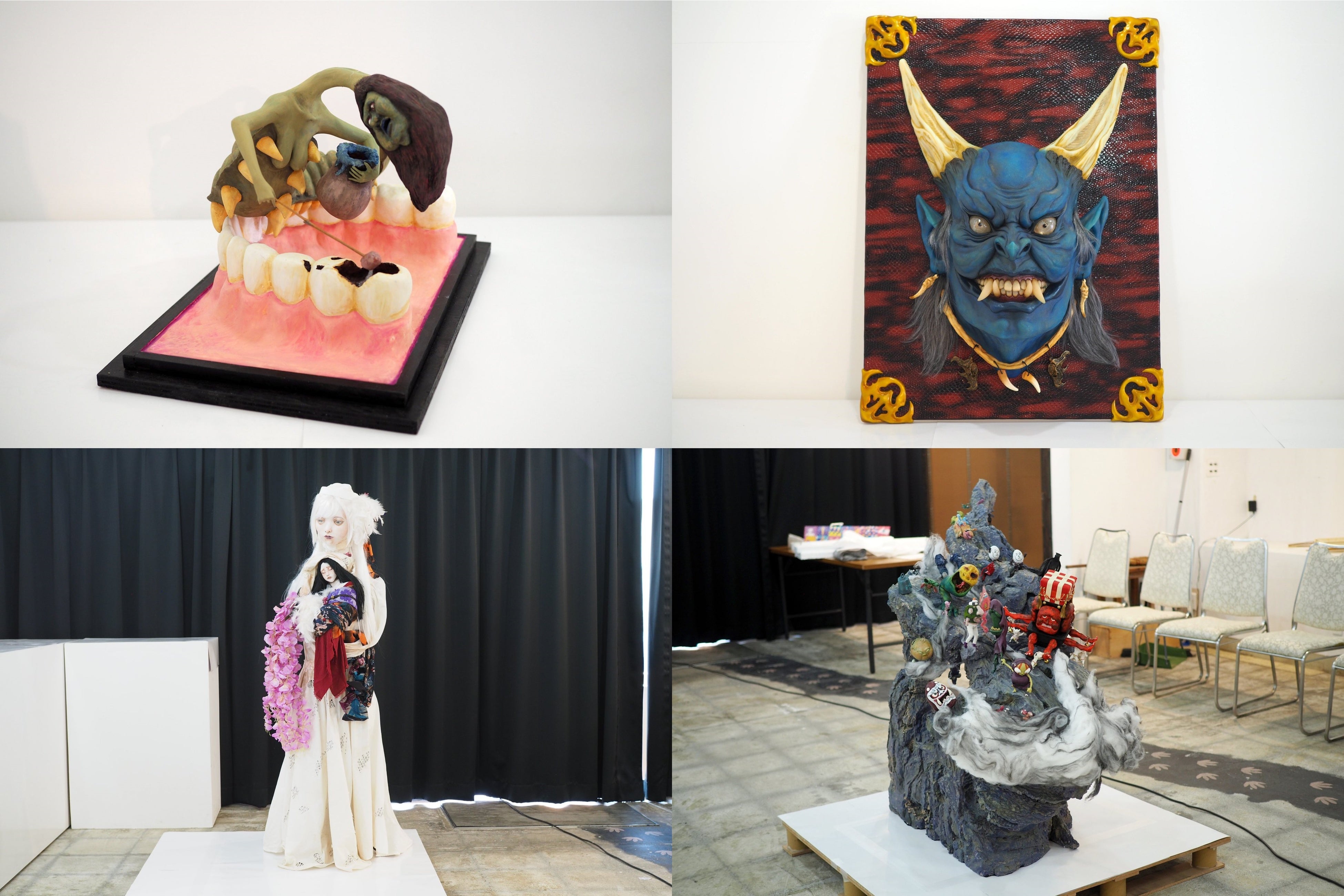 妖怪美術館で展示している立体造形作品は、2013年(第1回)から2018年(第5回)までに応募された全作品で累計828点あります。作者は模型やフィギュア製作が好きな方、美術系の学生、などアマチュアをはじめプロの造形作家など多彩で、年齢は3歳から83歳、地域は北海道から沖縄、そして一部台湾や香港からの応募作品もあります。「妖怪」の立体造形作品であればなんでもOKで、応募作品のほとんどがオリジナル。現代の感覚で生まれた多種多様で個性的な妖怪がアート作品として集積しています。