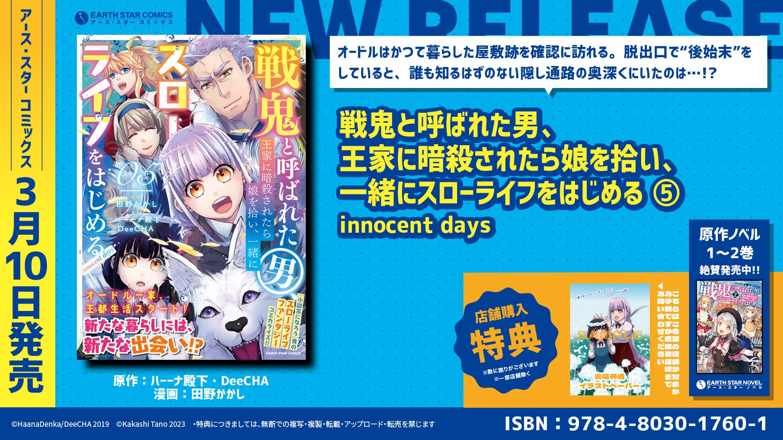 アース・スターノベルで刊行中のノベルが原作で、現在コミック アース・スターで掲載中の人気作品『戦鬼と呼ばれた男、王家に暗殺されたら娘を拾い、一緒にスローライフをはじめる innocent days』第5巻を3月10日(金)に発売いたします。