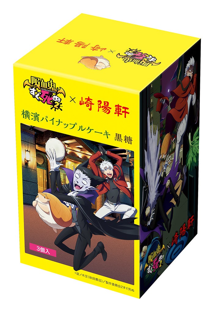 「吸血鬼すぐ死ぬ」は新横浜の街を舞台にした作品として2021年10月にアニメーションの第一期がTV放送され、2023年1月に「吸血鬼すぐ死ぬ2」として第二期放送を開始いたしました。第二期の放送を記念し、舞台である横浜の地に多くの方にお越しいただき、横浜を盛り上げるために「横濱パイナップルケーキ 黒糖」を3つ詰め合わせて「吸血鬼すぐ死ぬ2」のイラストをあしらった特別なパッケージにて販売いたします。