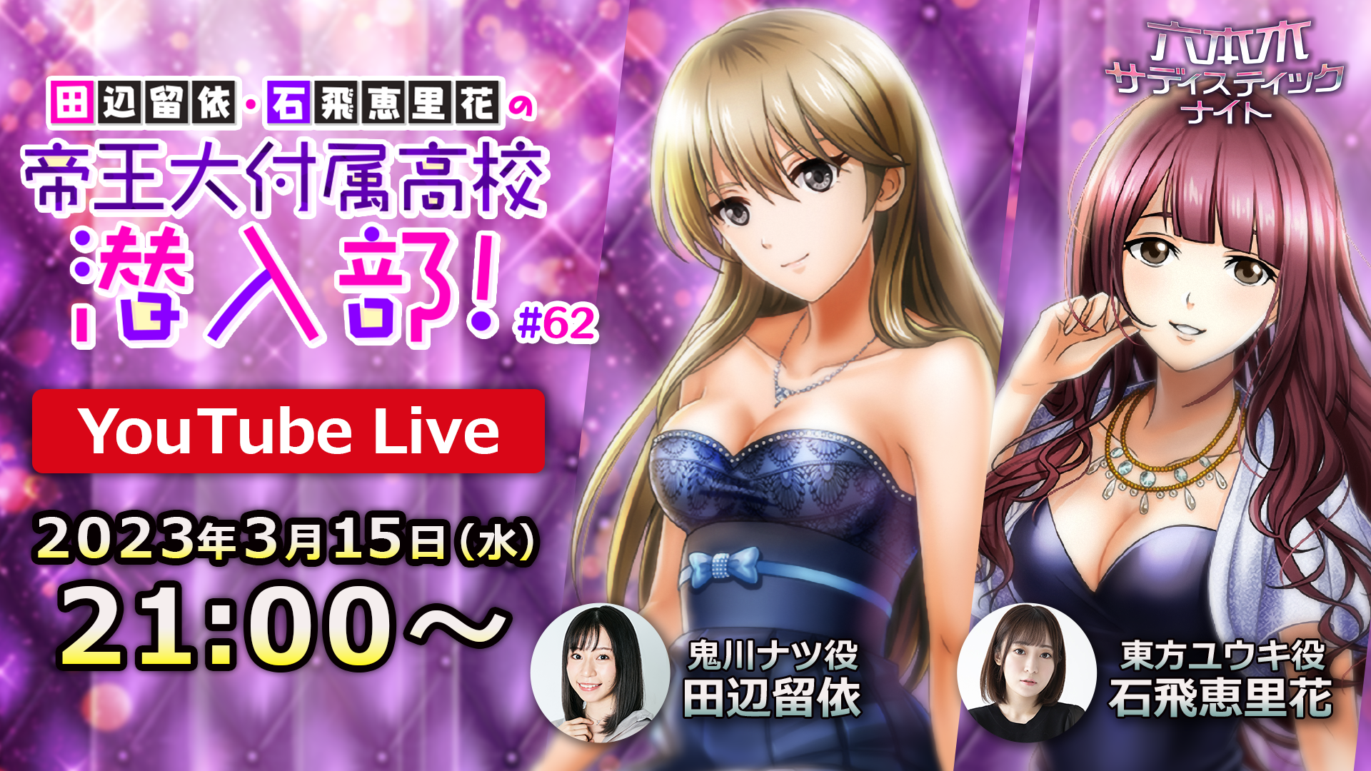 株式会社ボルテージ(本社:東京都渋谷区 代表取締役:津谷 祐司)は、現在配信中のカード型サスペンスアプリ「六本木サディスティックナイト」の公式YouTube番組「田辺留依・石飛恵里花の帝王大付属高校潜入部!#62」を3月15日(水)21:00より生配信することをお知らせいたします。