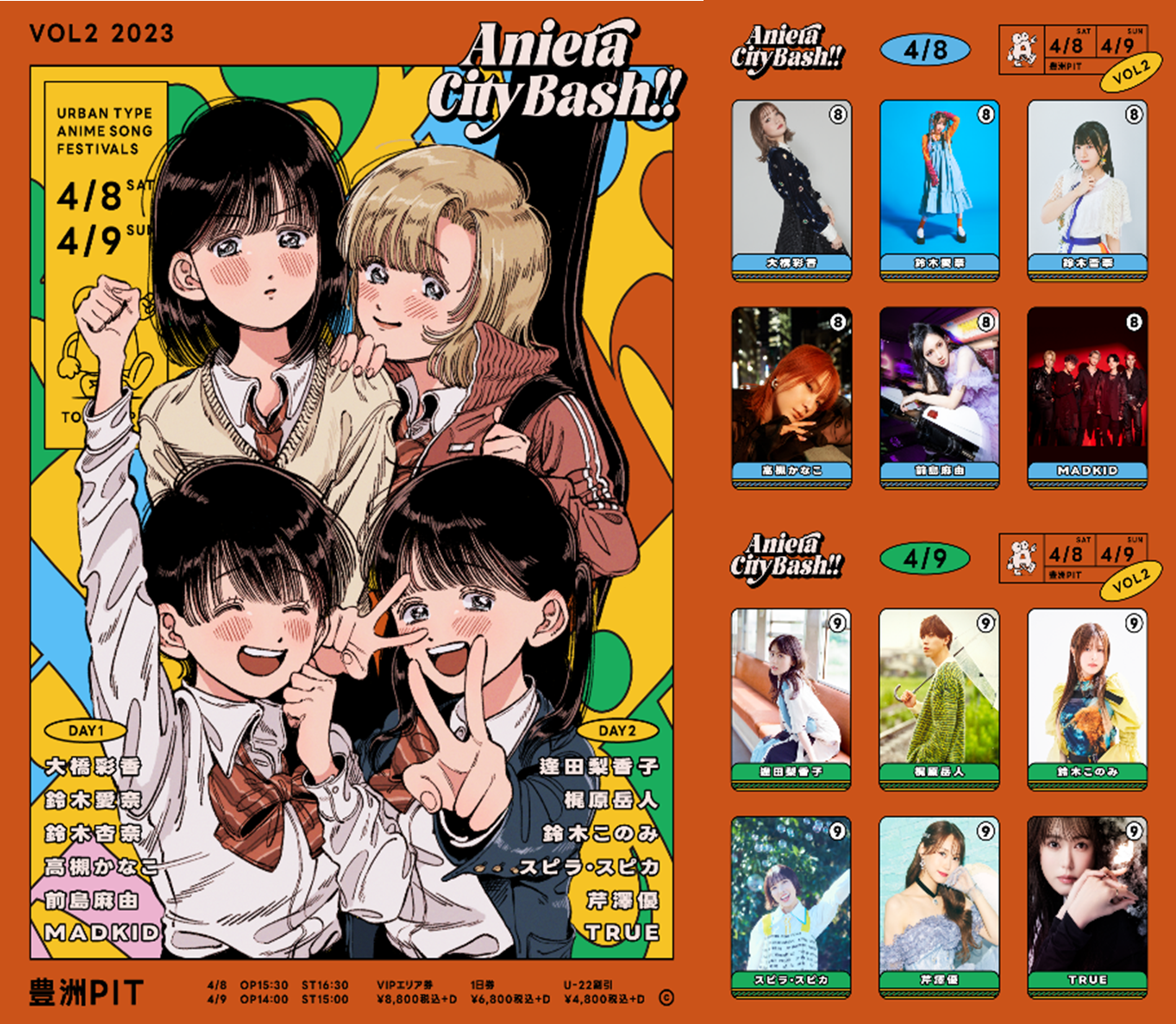 毎年9月に長野県で開催される野外アニソンフェス「ナガノアニエラフェスタ」を手掛けたスタッフ陣で送る都市型アニソンイベント「Aniera City Bash‼」が昨年の5月に開催されて以来、約1年ぶりに第二弾イベントを開催。その名も「Aniera City Bash‼vol.2」が東京豊洲PITにて4月8日(土)、4月9日(日)の2日間に渡り開催されます。