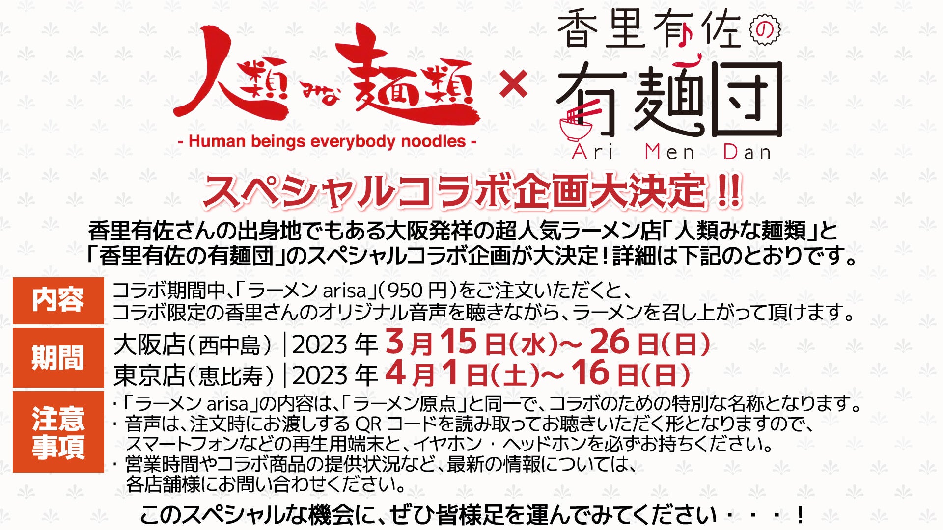 また、「香里有佐の有麺団」と超人気ラーメン店「人類みな麺類」のスペシャルコラボ企画が決定いたしました。