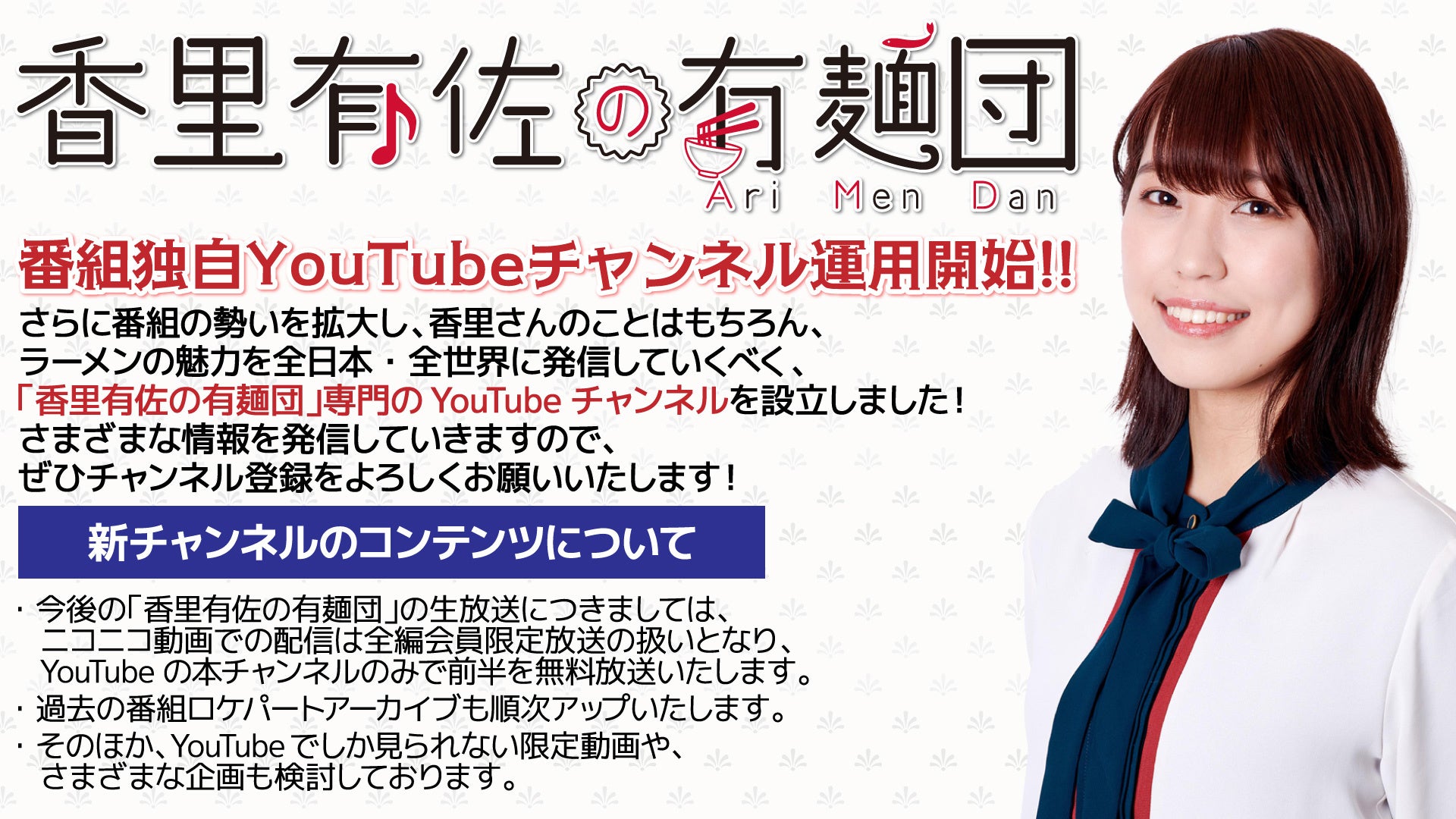 - 「香里有佐の有麺団」の番組独自YouTubeチャンネル運用を開始いたします。