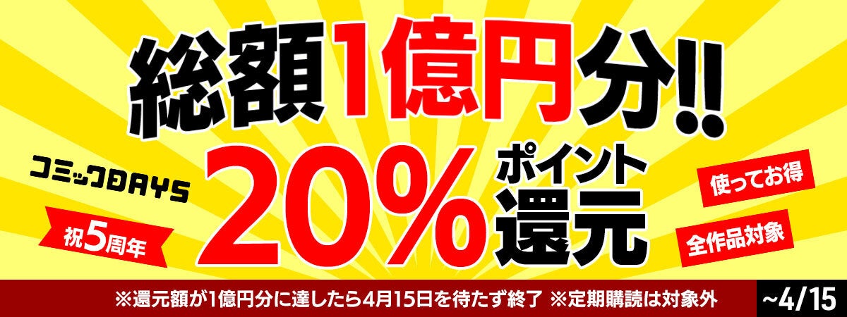 期間中にコミックDAYSで話または単行本を購入された方に、購入額の20%相当分のコミックDAYSで使えるポイントを総額1億円分進呈します。 ※2