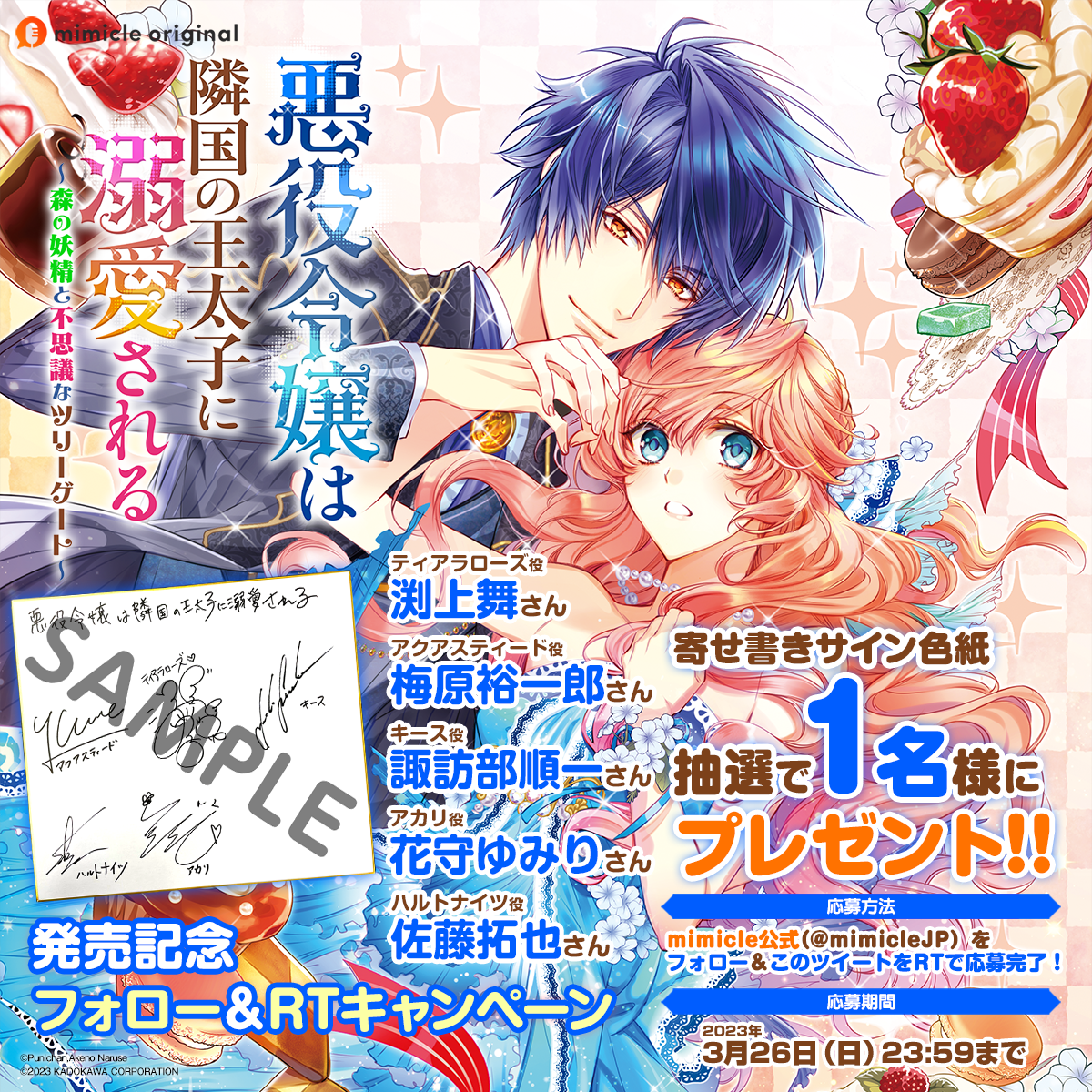 『悪役令嬢は隣国の王太子に溺愛される ~森の妖精と不思議なツリーゲート~』の発売を記念してフォロー&RTキャンペーンを開催。キャンペーン期間中にmimicle公式(@mimicleJP)をフォローしたうえでキャンペーンツイートをリツイートすれば応募完了となります。抽選で1名様に「出演声優陣(渕上舞さん/梅原裕一郎さん/諏訪部順一さん/花守ゆみりさん/佐藤拓也さん)の寄せ書きサイン色紙」をプレゼントいたします。
