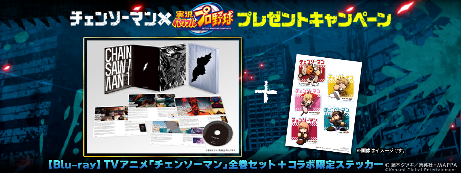 本コラボレーションを記念して、「パワスピ・ポイントクラブ」に『チェンソーマン』アイテムが明日3月16日(木)から登場!『パワプロアプリ』ゲーム内ミッションをクリアすると、【Blu-ray】TVアニメ『チェンソーマン』全巻セットと「コラボ限定ステッカー」等を手に入れるチャンスです!