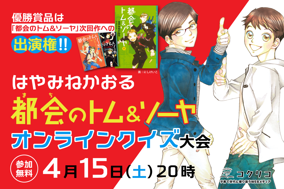■申込⽅法:下記の講談社コクリコ「都会のトム&ソーヤ」オンラインクイズ大会特設ページからお申し込みください。申し込みの際は講談社コクリコCLUB会員への登録が必要になります。(会員登録がお済みでない方は、登録手続きをお願いします)申込完了後に、応募完了メールをお送りします。未成年の方が参加される場合は保護者の方が保護者ご自身の名義で登録を行ってください。