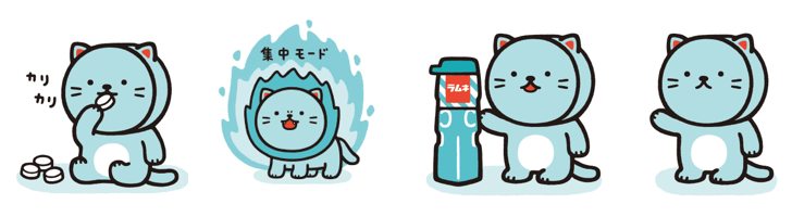 子供のころからよく食べていたラムネの新キャラクターのデザインを担当させていただきとても嬉しいです。50年もの歴史があるラムネとともに、この先ずっと長く愛されていくキャラクターになってほしいという想いでデザインしました。どちらのキャラクターも、ラムネの特徴であるころんと丸くかわいい形や水色と赤のイメージカラーを使いラムネらしさを出しつつ、できる限りシンプルなデザインになるように心がけました。