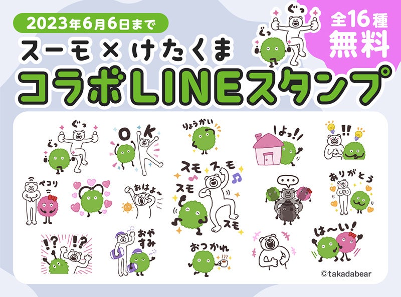 人気スタンプクリエイターのたかだべあ氏が描く、「けたくま」と「スーモ」がコラボレーションした16種類のLINEスタンプを制作しました。「スーモ」だけでなくスーモファミリーである「スモミ」や「ドンスーモ」も「けたくま」と一緒に登場しています。おもしろ可愛いコラボLINEスタンプは、無料でダウンロードできます。ぜひこの機会に使ってみてください。