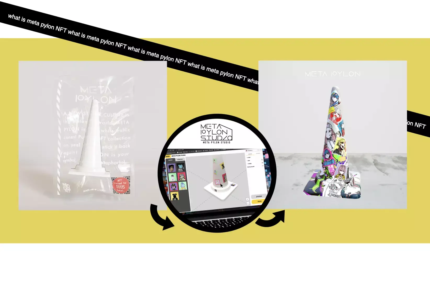 META PYLON PROJECTは、META PYLON NFT、META STICKER NFT、META PYLON STUDIOからなるカスタム3D NFTプロジェクトです。特許を取得したステッカーカスタムシステムによる立体上にNFTのビジュアルをステッカーのように貼り付ける機能により、メタバース上のあらゆる立体物の自在なカスタマイズを実現します。ウォレットに集めたNFTのコレクションを、お気に入りのシールとしてどこにでも貼り付けられ、それ自体が新しいNFTとなる新体験を提供致します。