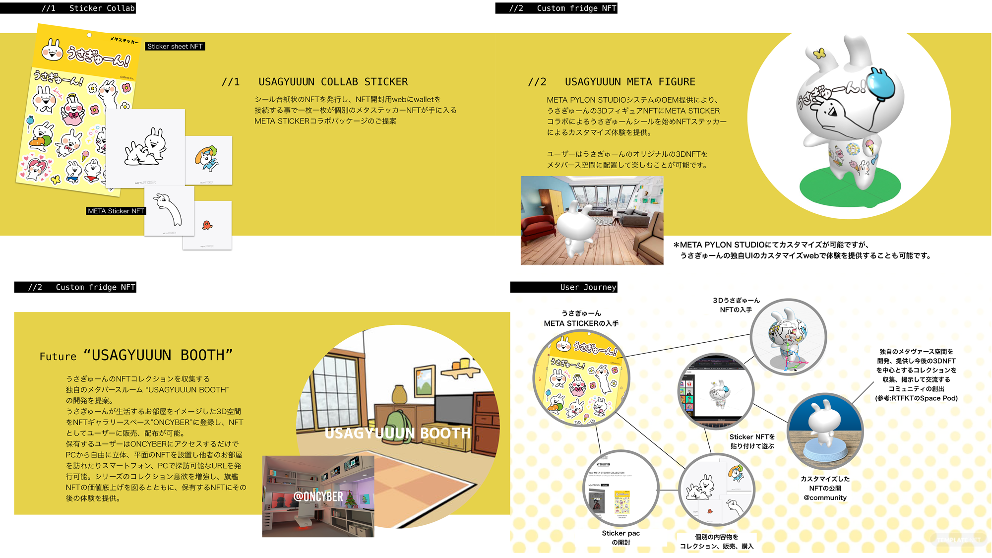 うさぎゅーんのNFTコレクションを収集する 独自のメタバースルーム “USAGYUUUN BOOTH” を開発。うさぎゅーんが生活するお部屋をイメージした3D空間 をNFTギャラリースペース”ONCYBER”等にて展開し、NFTとしてユーザーに販売、配布が可能に。