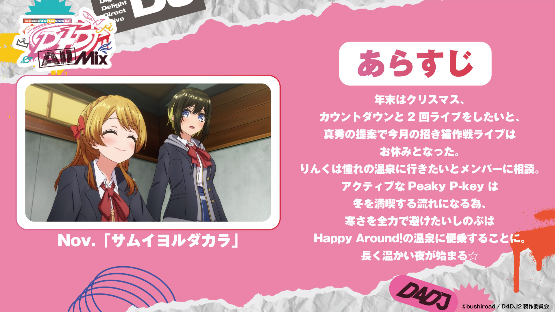 末はクリスマス、カウントダウンと2回ライブをしたいと、真秀の提案で今月の招き猫作戦ライブはお休みとなった。りんくは憧れの温泉に行きたいとメンバーに相談。アクティブなPeaky P-keyは冬を満喫する流れになる為、寒さを全力で避けたいしのぶはHappy Around!の温泉に便乗することに。長く温かい夜が始まる☆