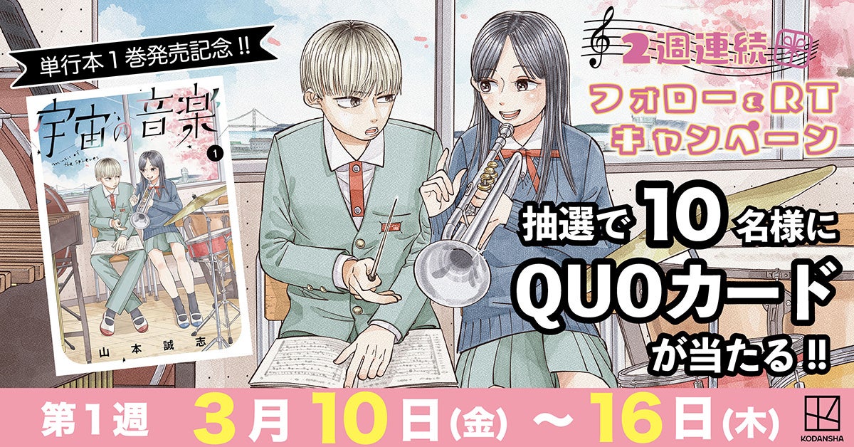また、このコミックス発売を記念して現在フォロー&RTでプレゼントが当たるTwitterキャンペーンを実施中!本日23:59までは第1弾としてQUOカードが10名様に、3月17日~23日まではサイン入り複製原画が10名様に当たるキャンペーンを開催しています。作品公式アカウント(@utyunoongaku)をフォローして最新情報をご確認ください!