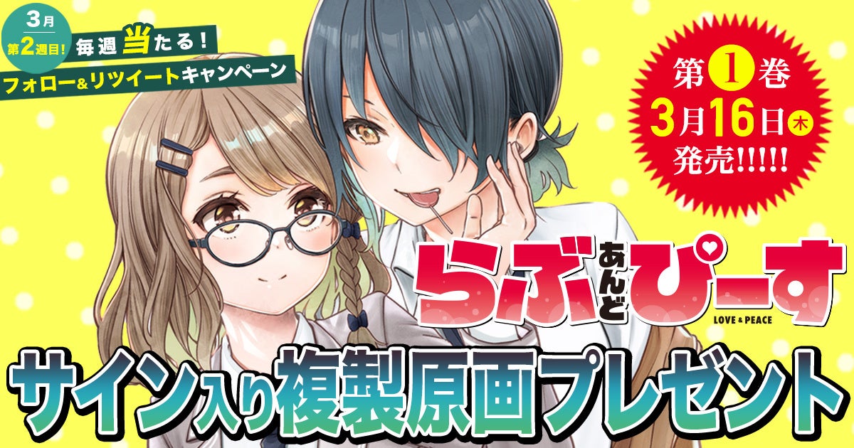 月刊少年マガジンで好評連載中の青春学園コメディ『らぶ あんど ぴーす』のコミックス第1巻が本日発売となりました!本作は『はたらく細胞BLACK』の原田重光先生と『なんでここに先生が!?』の蘇募ロウ先生がタッグを組んだ青春学園コメディ。「百合」の波動を感じ取る男子高校生が人知れず学園の平和を守るというあらすじで、奇跡のコンビが描く尊くてエロい学園コメディをお楽しみください!