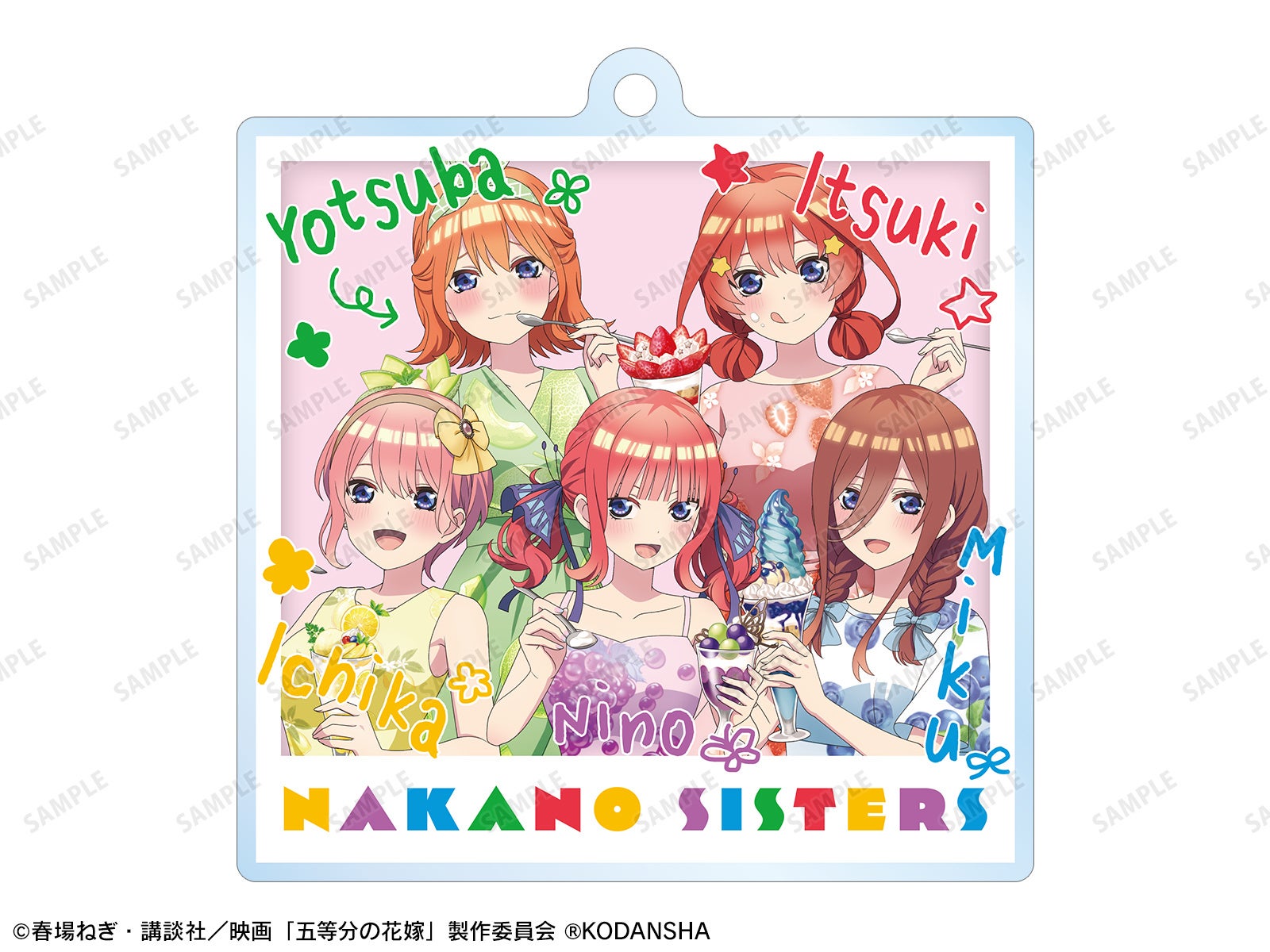 今回のイベントに向けて、映画『五等分の花嫁』より、五つ子たちがフルーツ柄のドレスを着てフルーツパフェを食べている新規描き下ろしイラストをご用意いたしました。この描き下ろしイラストを使用した商品を多数先行販売する他、お買上げ抽選会などの実施を予定しております。