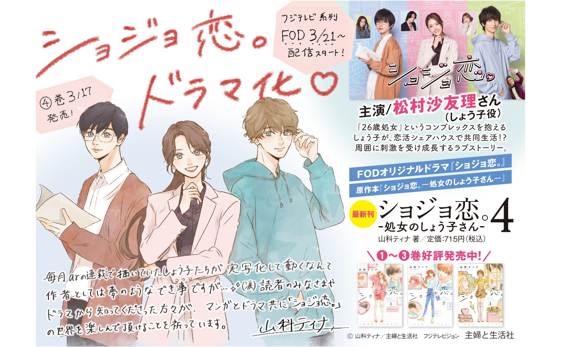 女優の松村沙友理が主演のドラマ『ショジョ恋。』は、3月21日(火)0時よりFODにて配信。こちらのドラマの原作本、山科ティナの漫画『ショジョ恋。―処女のしょう子さん―』第4巻を3月17日(金)発売します。