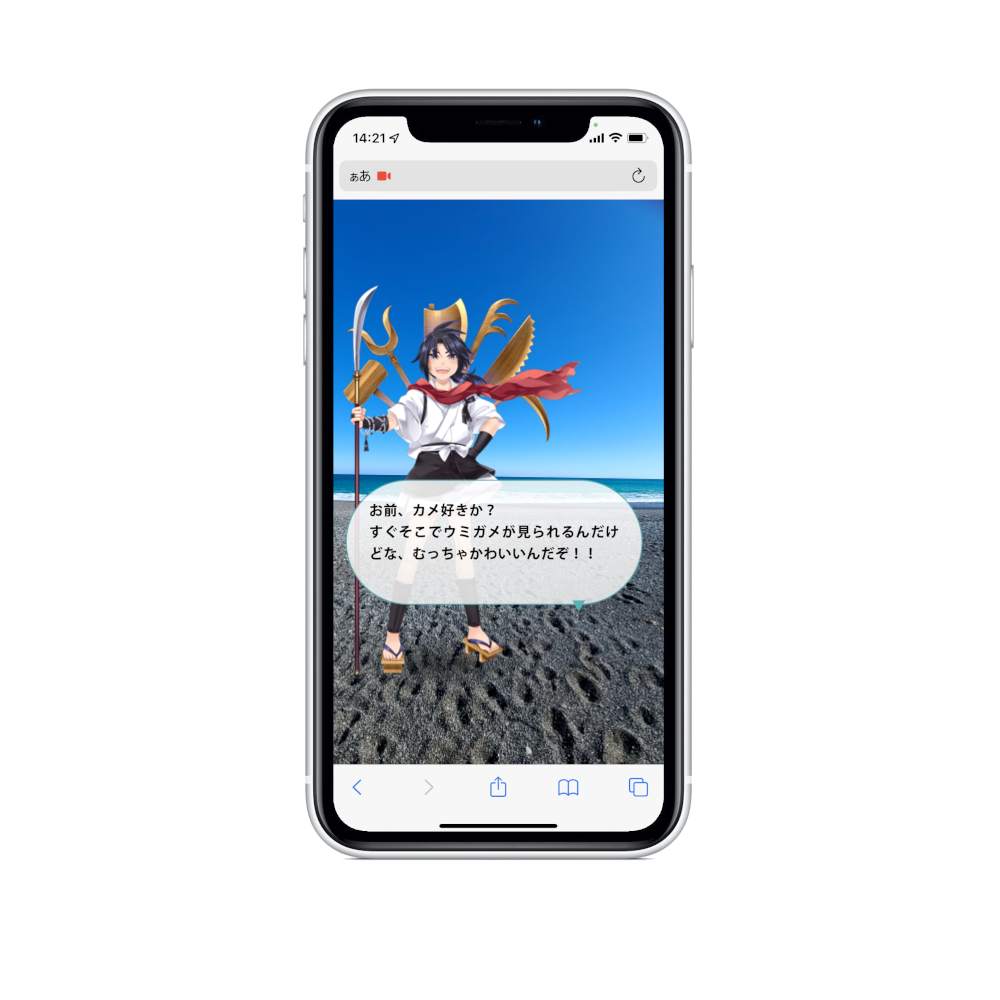 AR起動時、画面上のキャラクターがアニメーションし、タップ時に音声付きで語りかけます。