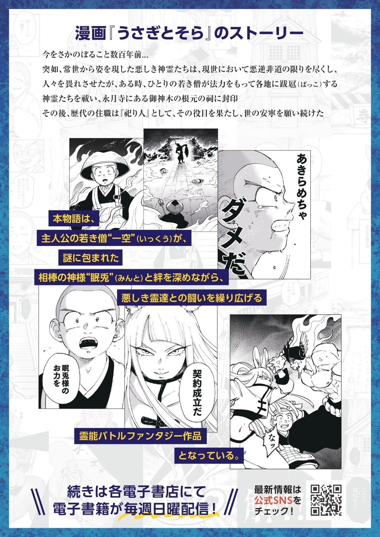 株式会社スクランブル(本社:東京都渋谷区、代表取締役:淀瀬博行、以下「スクランブル」)は、同社が制作を手掛ける霊能バトルファンタジー漫画『うさぎとそら』(©三定加・UKA / SRAMBLE INC.)を、2023年3月19日(日)より「コミックシーモア、Amebaマンガ、DMMブックス、FOD」などの人気電子書店での、電子書籍の配信を開始致しました。