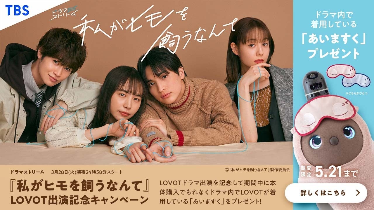 ロボットベンチャーのGROOVE X 株式会社(本社:東京都中央区日本橋、代表取締役社長:林要)は、3月20日(月)〜5月21日(日)の期間中、『LOVOT[らぼっと]』が3月28日(火)深夜24時58分からスタートするドラマストリーム『私がヒモを飼うなんて』(通称「わたヒモ」)への出演を記念したキャンペーンを開催いたします。