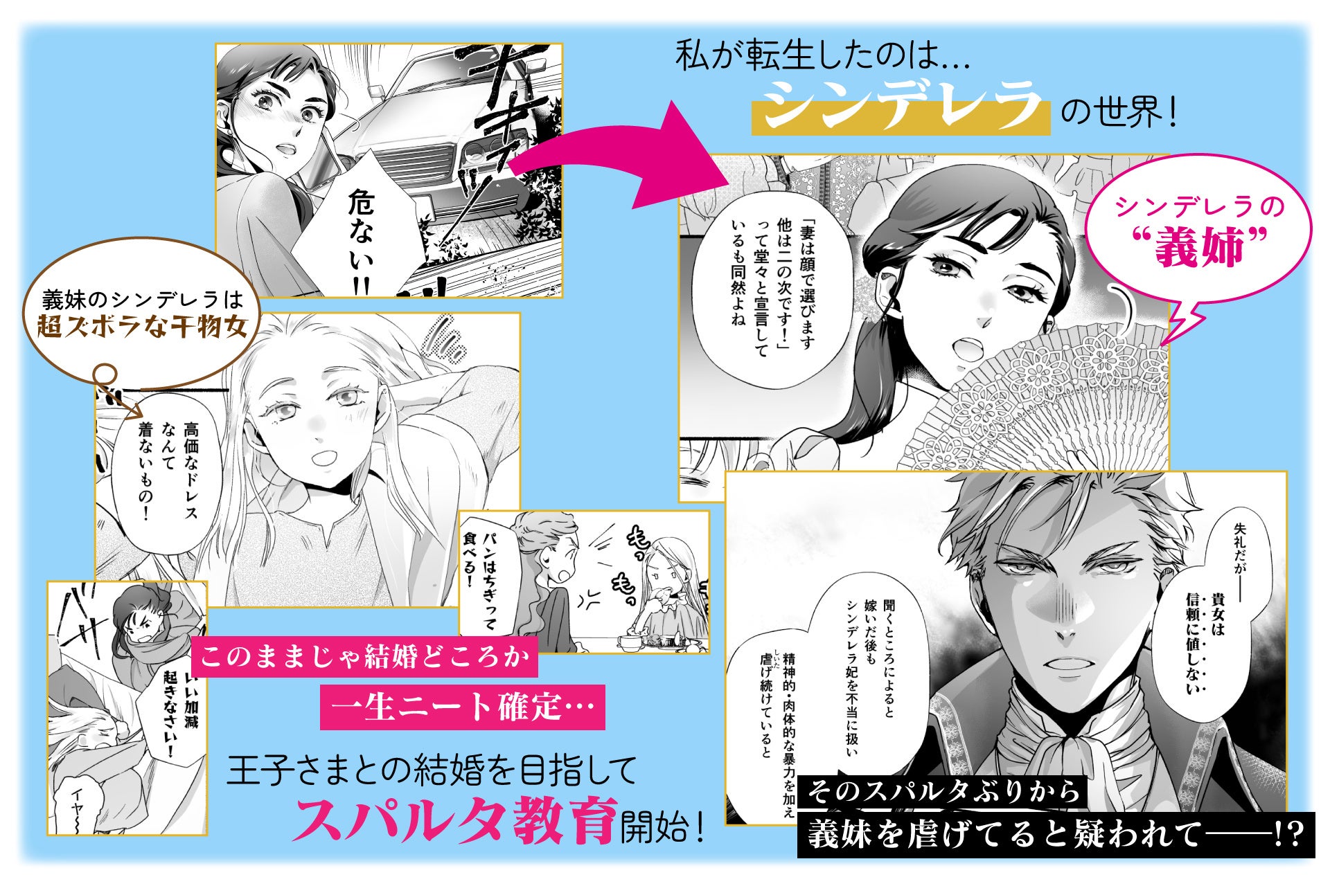 突然の事故から転生した先は、童話「シンデレラ」の世界!真面目にバリバリ働いて仕事一筋だった私が生まれ変わったのは、シンデレラの義姉・ペトラ。義妹であるシンデレラは天使のように可愛いけれど予想外にズボラな干物女だった!「このままだと王子に嫁ぐのは無理!」ペトラともう一人の姉は、シンデレラを立派な淑女に育てあげるため教育開始!そのスパルタぶりから世間では「意地悪な義姉」と噂されてしまう…。そのうえ舞踏会で声をかけてきた謎の男に「あなたが嫉妬のあまり義妹を虐げていると聞いた」と口撃されて――!?
