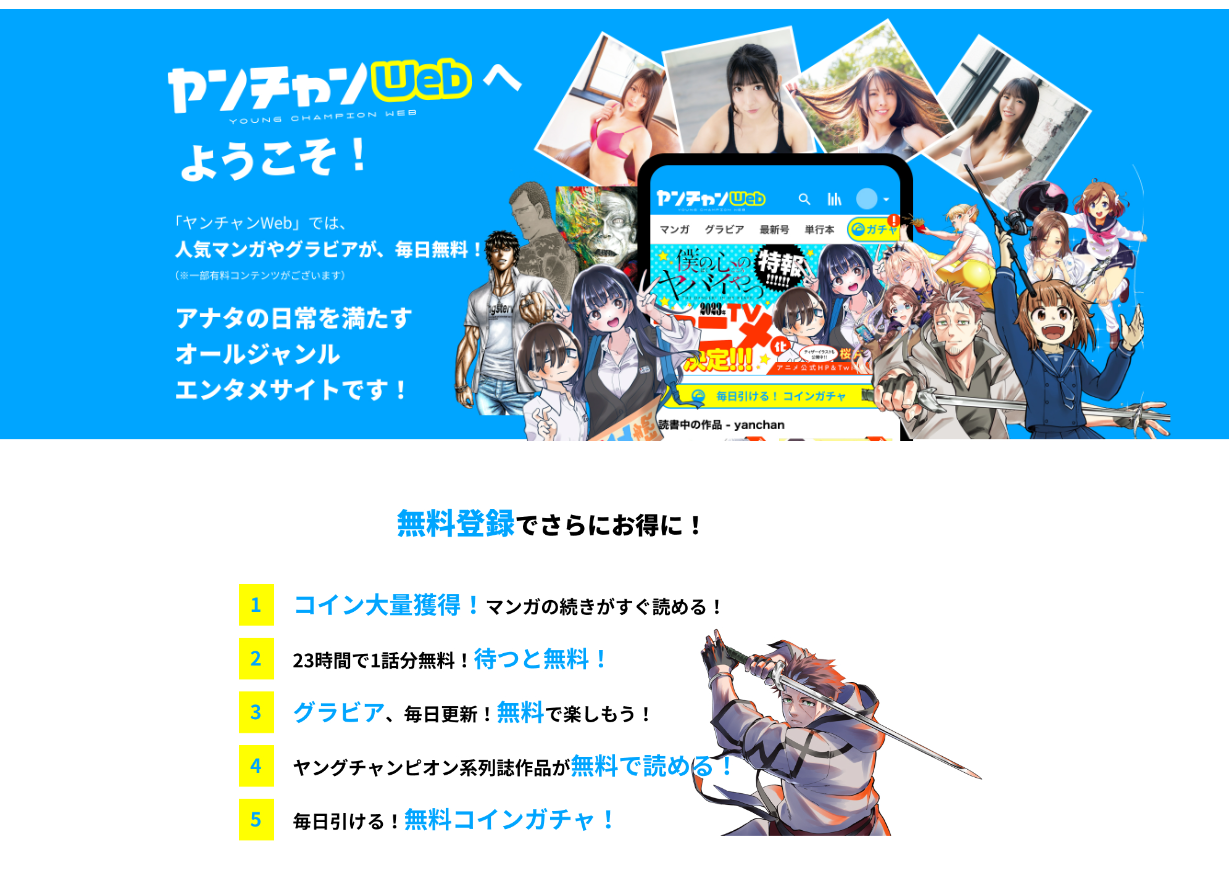 ヤンチャンWebでは「ヤングチャンピオン」系列4誌作品を中心に、青年マンガ、ウェブトゥーン、ヤンチャンWebオリジナルといった関連雑誌・媒体の作品をスピーディーに読者にお届けいたします。