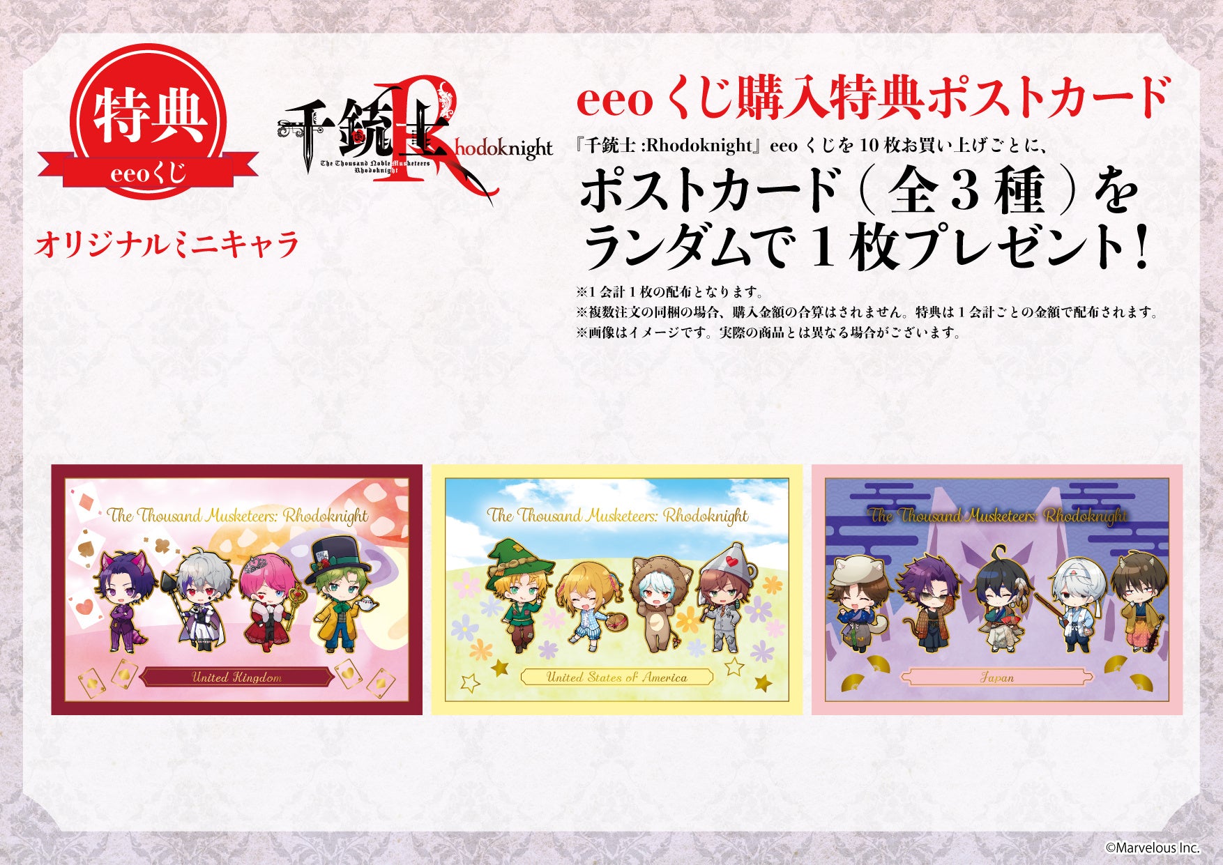 『千銃士:Rhodoknight』の「eeoくじ」を10枚お買い上げごとに、ポストカード(全3種)をランダムで1枚プレゼント! こちらのポストカードは1会計1枚の配布で、数量限定となっています。なくなり次第、配布終了となりますので「eeoくじ」のご購入はお早めに!