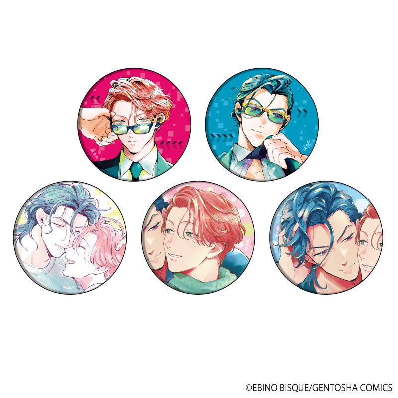 直径65mmの大きめ缶バッジは、新規描き下ろしイラストを含む全5種がラインナップ。仕事中のワイルドな真利生&クールな理一、そして愛おしそうに微笑み合う2人をじっくり拝めます♪