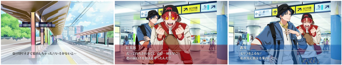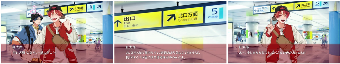 紅太郎先生:普段何気なくみている街にも、たくさん色が使われてるんだね!いろんな人のことを考えてデザインされていて、俺感動した…!もっと探検したいな〜。…さっきは青斗が来て邪魔が入っちゃったし、今度はふ、二人っきりで、行きたいな〜なんて!!!