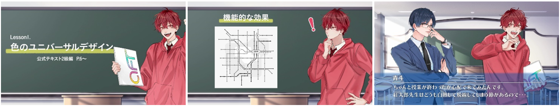 このたび公開となる第1話「色のユニバーサルデザイン」では、梶裕貴さん演じる熱血漢な紅太郎先生が、色の役割について街を探索しながら講義します。恋愛シミュレーションゲームのように、動画の主人公は視聴者ご自身で、「色彩学園」に通う生徒として物語が進みます。石川界人さん演じるクールな青斗先生も現れ、主人公を取り合う様子も。色彩の勉強はもとより、物語のドキドキする展開もお楽しみください。