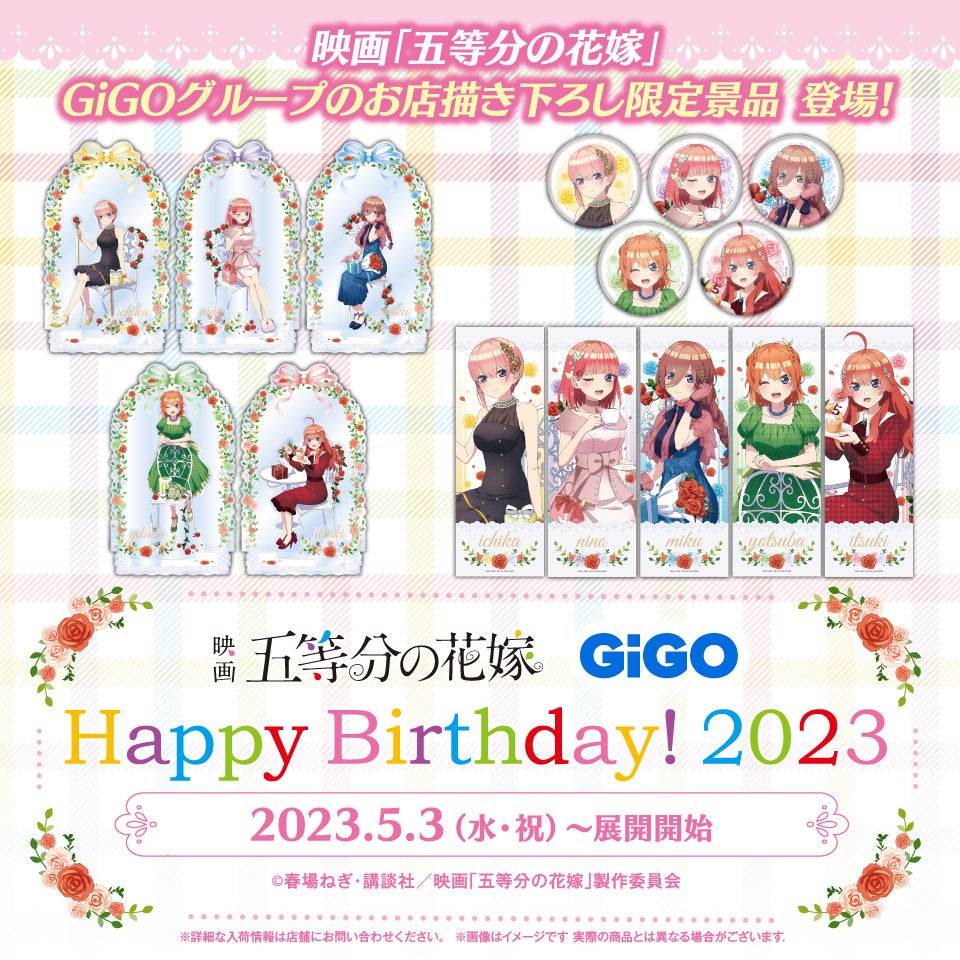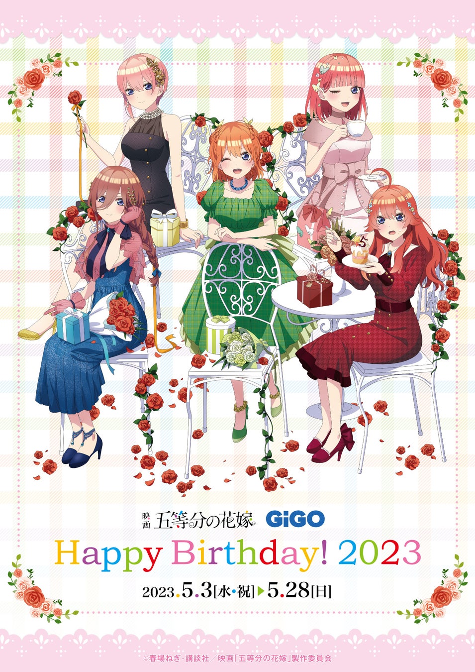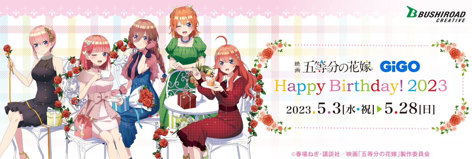 株式会社ブシロード(本社:東京都中野区、代表取締役社長:木谷高明)のグループ会社にあたる株式会社ブシロードクリエイティブ(本社:東京都中野区、代表取締役社⻑:成⽥耕祐)は、5月3日(水・祝)より対象のGiGOグループのお店にて『映画 「五等分の花嫁」 Happy Birthday! 2023』の期間限定イベントを開催いたします。