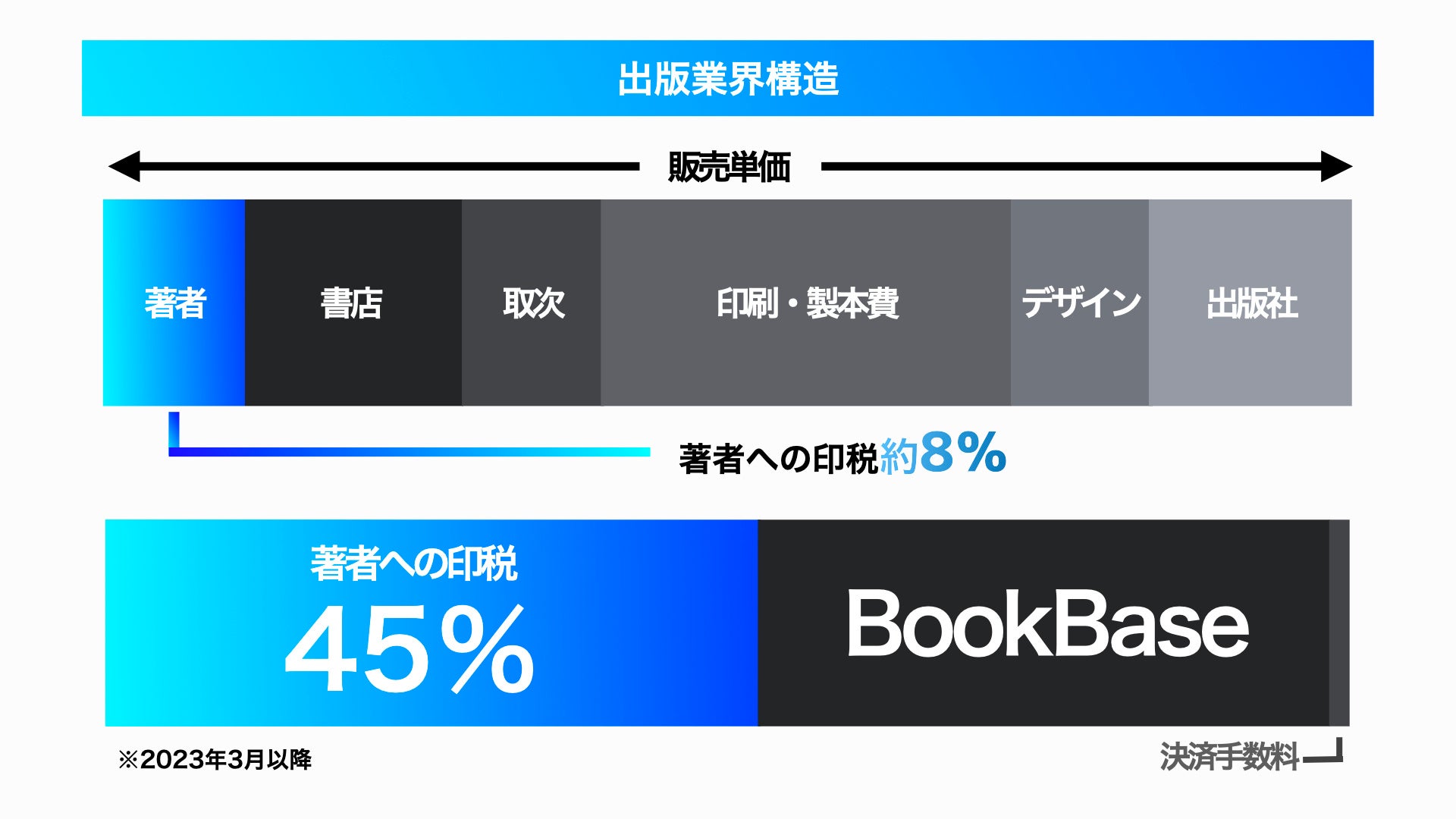 これに対してBookBaseでは、電子書籍を主体とするオンラインプラットフォームにてワンストップで制作から販売までを行うことができるシステムとすることで、従来の出版社と同様のサポート体制をつくりながら、印税45%(2023年3月以降)とこれまでの約5〜6倍の高還元率を実現しています。