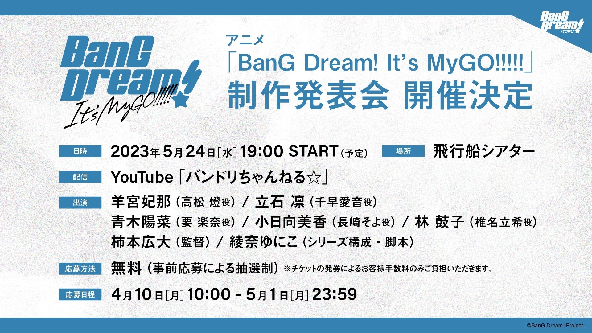 - アニメ「BanG Dream! It’s MyGO!!!!!」制作発表会の開催が決定!
