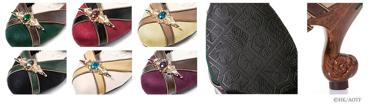 つま先には自由の翼をイメージしたチャームを取り付け、アウトソールには、本商品のために特別に起こした兵団マークデザインを採用。ヒールには、調査兵団の馬の形状をイメージしたヴィンテージライクなウッド調ヒールを。細部までこだわり抜いたデザインを是非お楽しみください。