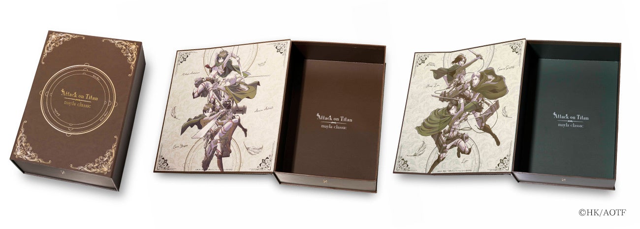 高級感あふれるブック型のBOXに、正面には3重の壁をイメージしたデザインを施し、中にはキャラクターたちの姿をデザインしました。クラシカルかつ上品な雰囲気で進撃の巨人の世界観を表現しています。