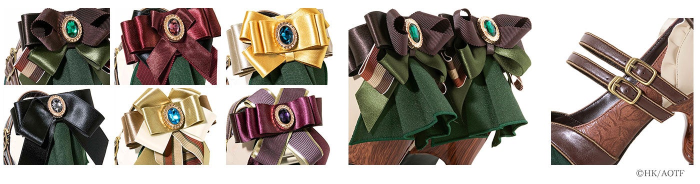シューズ背面には、キャラクターのイメージカラーや瞳の色をモチーフにしたリボン装飾と、調査兵団のマントをイメージしたフリルをあしらいました。甲には兵団服のベルトをイメージしたダブルストラップに、アッパーにはアンティーク模様の生地を採用し、進撃の巨人の世界観を表現。