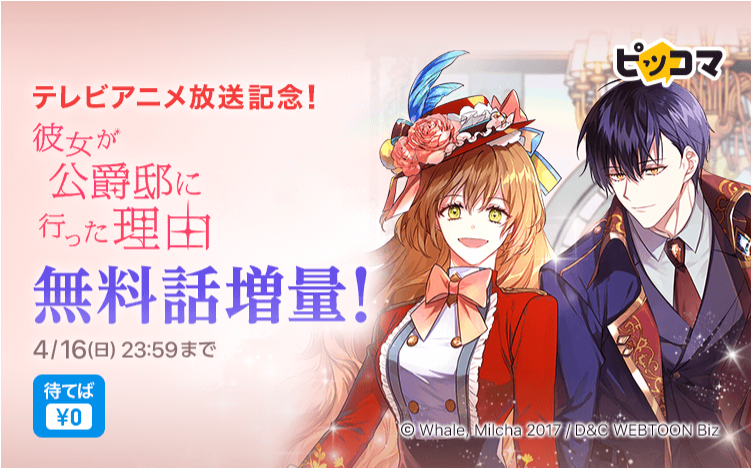 株式会社カカオピッコマ(本社:東京都港区、代表取締役社⻑:金在龍)の電子マンガ・ノベルサービス「ピッコマ」(https://piccoma.com/web/)では本日(4/10)よりテレビアニメが放送開始となる『彼女が公爵邸に行った理由』の放送開始を祝して無料話を4話から20話まで増量いたします。期間は4/10(月)から4/16(日)までです。