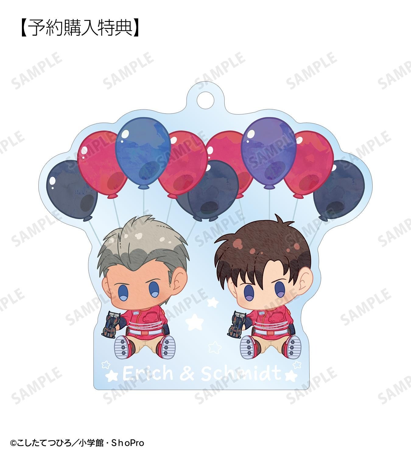 星馬 烈、星馬 豪、鷹羽 リョウ、J、ブレット・アスティア、ミハエル・フリードリヒ・フォン・ヴァイツゼッカー、エーリッヒ・クレーメンス・ルーデンドルフ、シュミット・ファンデルハウゼン・フォン・シューマッハ、カルロ・セレーニをお空に風船でぷかぷかと浮いたぬいぐるみをイメージして描き起こし、アクリルキーホルダーに仕上げました。