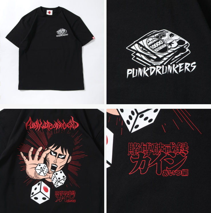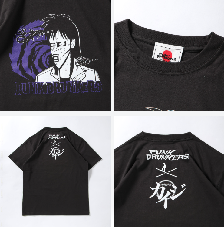 バックは、パンクドランカーズとカイジのロゴをかけてコラボ感を演出し、かける(×)の記号は、鉄骨渡りも表現していて、そこには鉄骨渡りをしているカイジが!