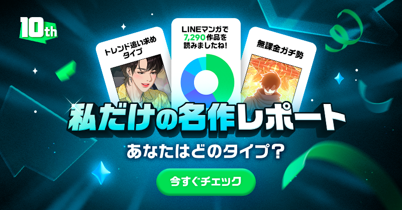 LINE Digital Frontier株式会社 (本社:東京都新宿区、代表取締役:金信培(キム・シンベ)/髙橋将峰) は、当社が運営する電子コミックサービス「LINEマンガ」https://manga.line.me/ がサービス開始10周年を迎えたことを記念し、ユーザー一人ひとりがこれまで「LINEマンガ」を利用した履歴を振り返ることができる「私だけの名作レポート」を本日公開しました。また、結果をSNSでシェアすると、最大でレポートに表示された消費コイン全額が還元されるキャンペーンを4月27日(木)まで開催中です。