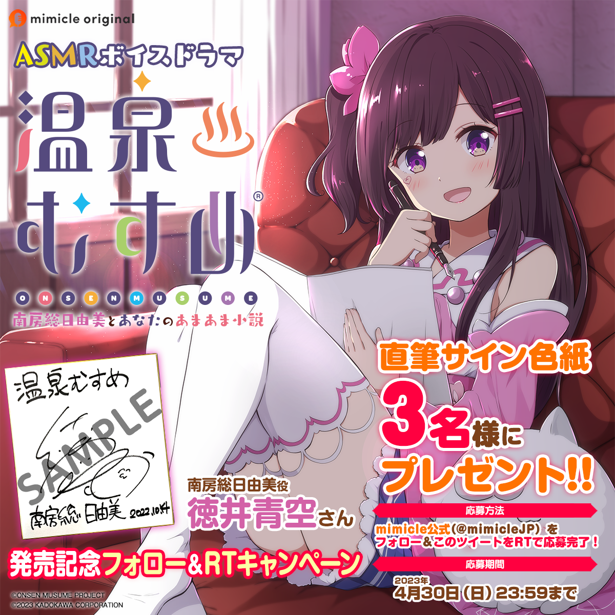 『ASMRボイスドラマ 温泉むすめ 南房総日由美とあなたのあまあま小説』の発売を記念してフォロー&RTキャンペーンを開催。キャンペーン期間中にmimicle公式Twitter(@mimicleJP)をフォローしたうえでキャンペーンツイートをリツイートすれば応募完了となります。抽選で3名様に「南房総日由美役 徳井青空さん直筆サイン色紙」をプレゼントいたします。
