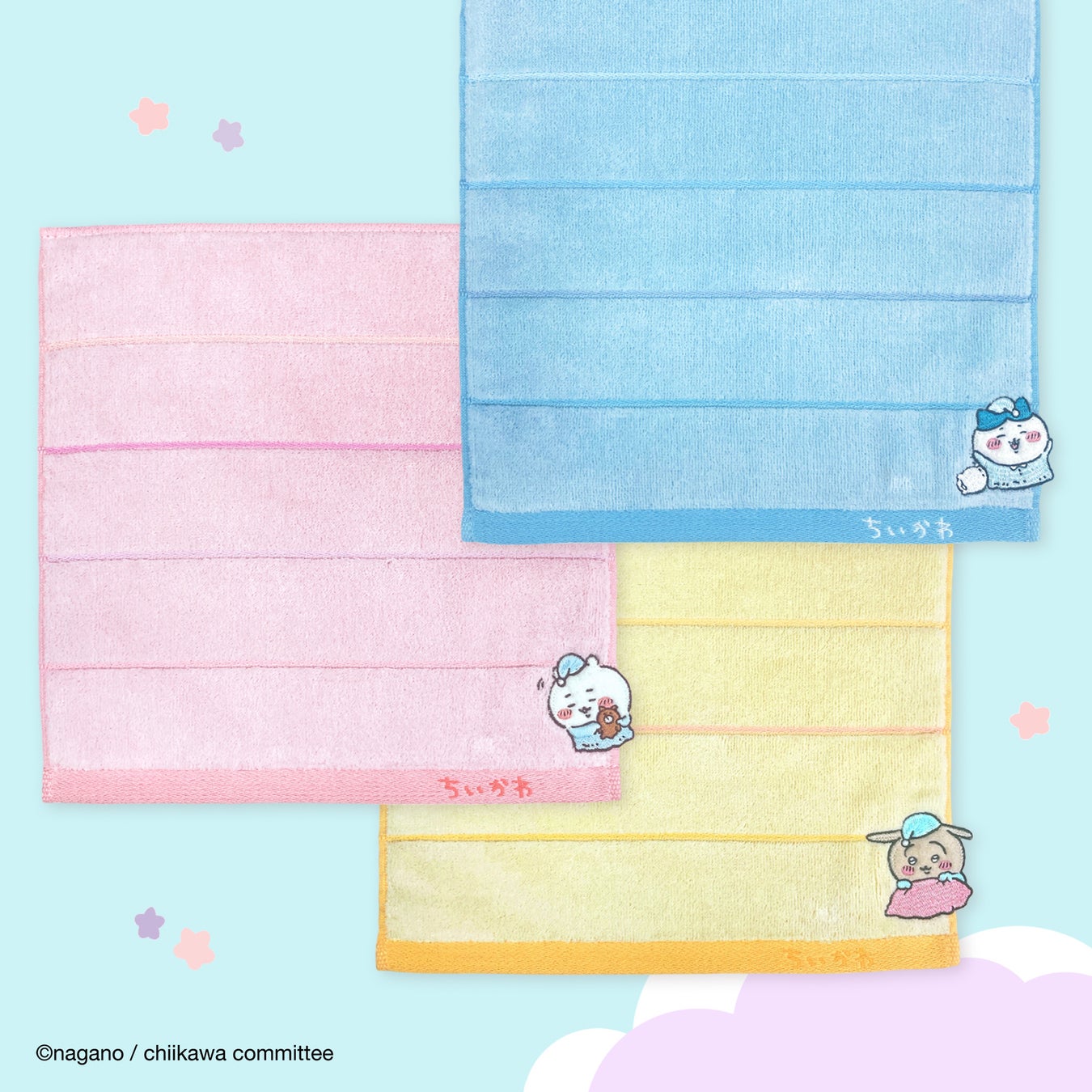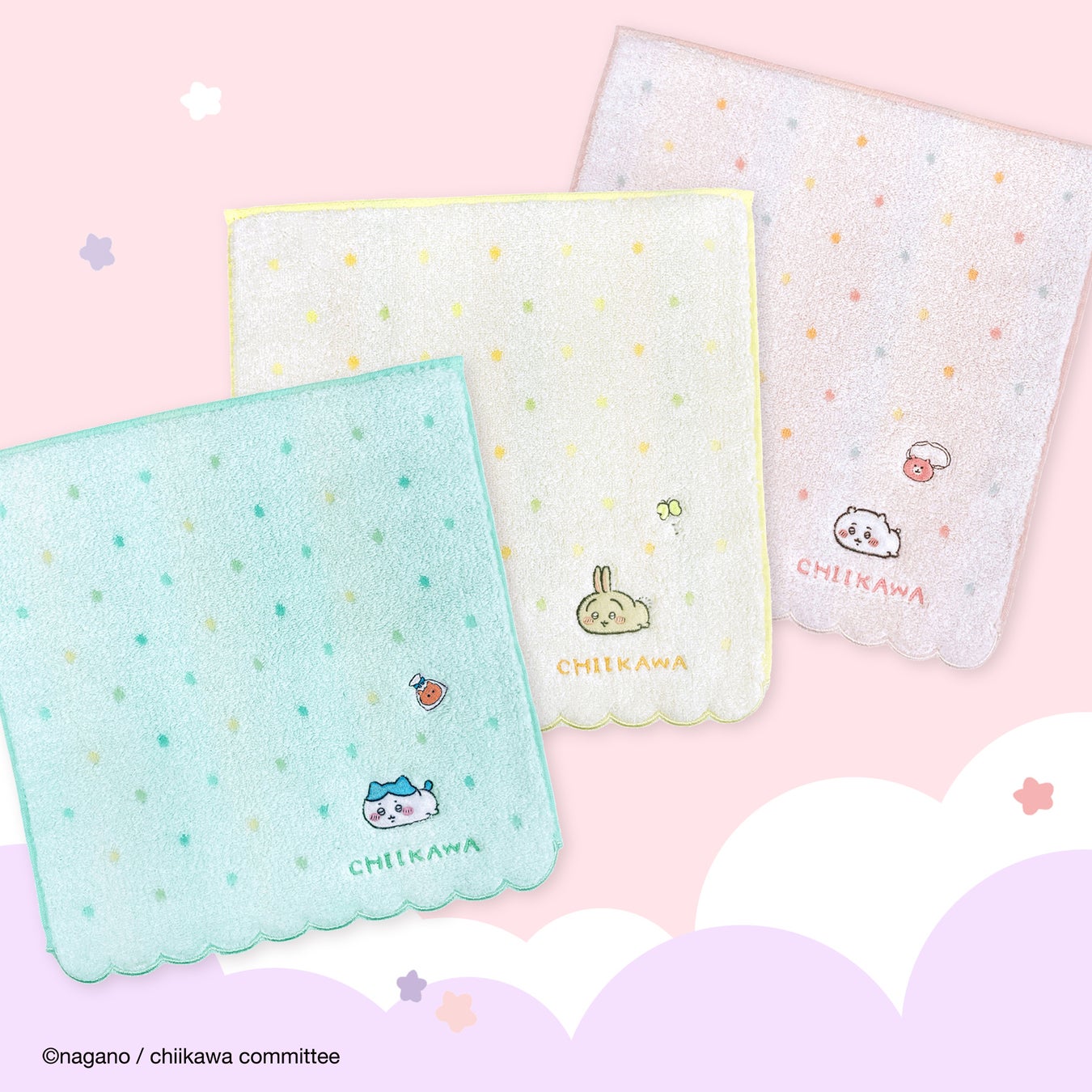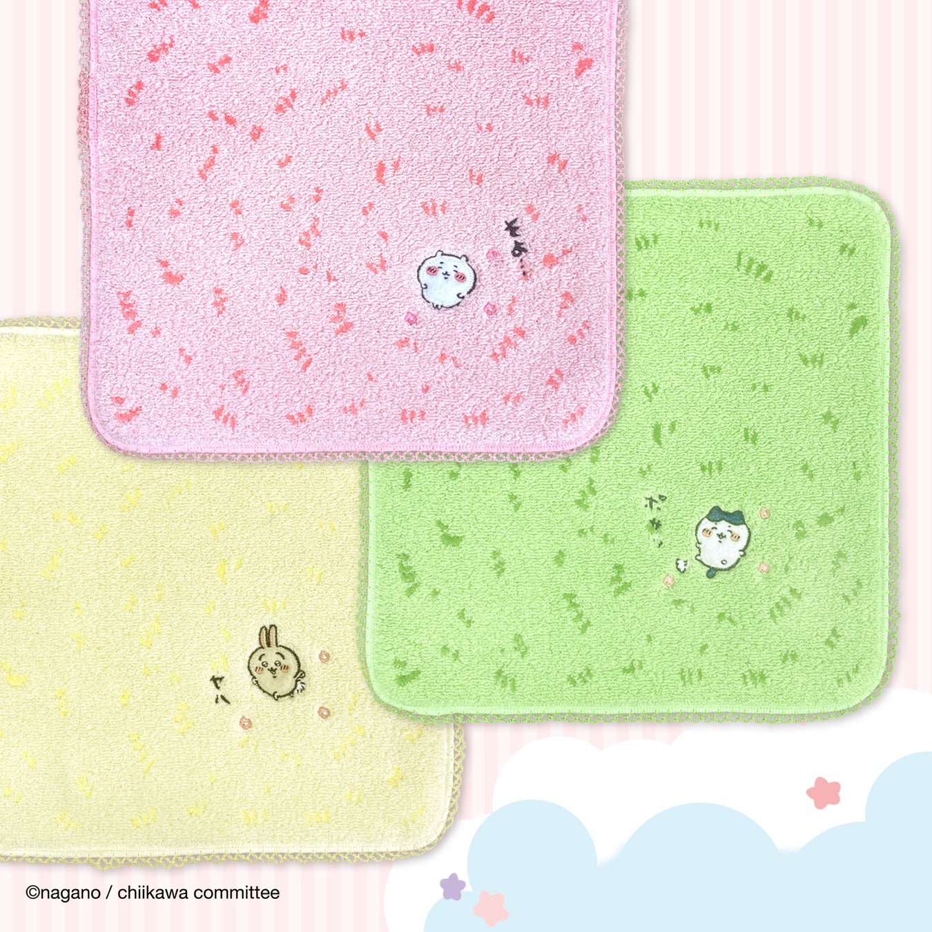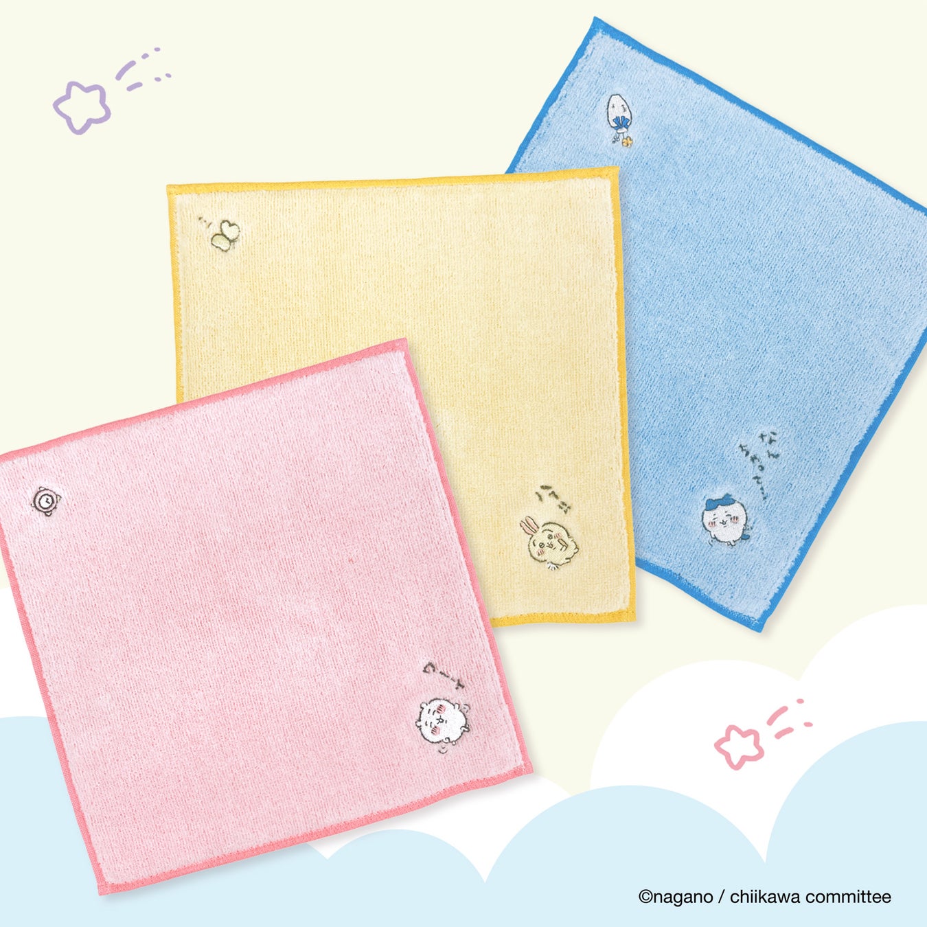 表情が楽しいちいかわやハチワレ、うさぎの顔が朱子部分に描かれたかわいいミニサイズのタオルハンカチ。