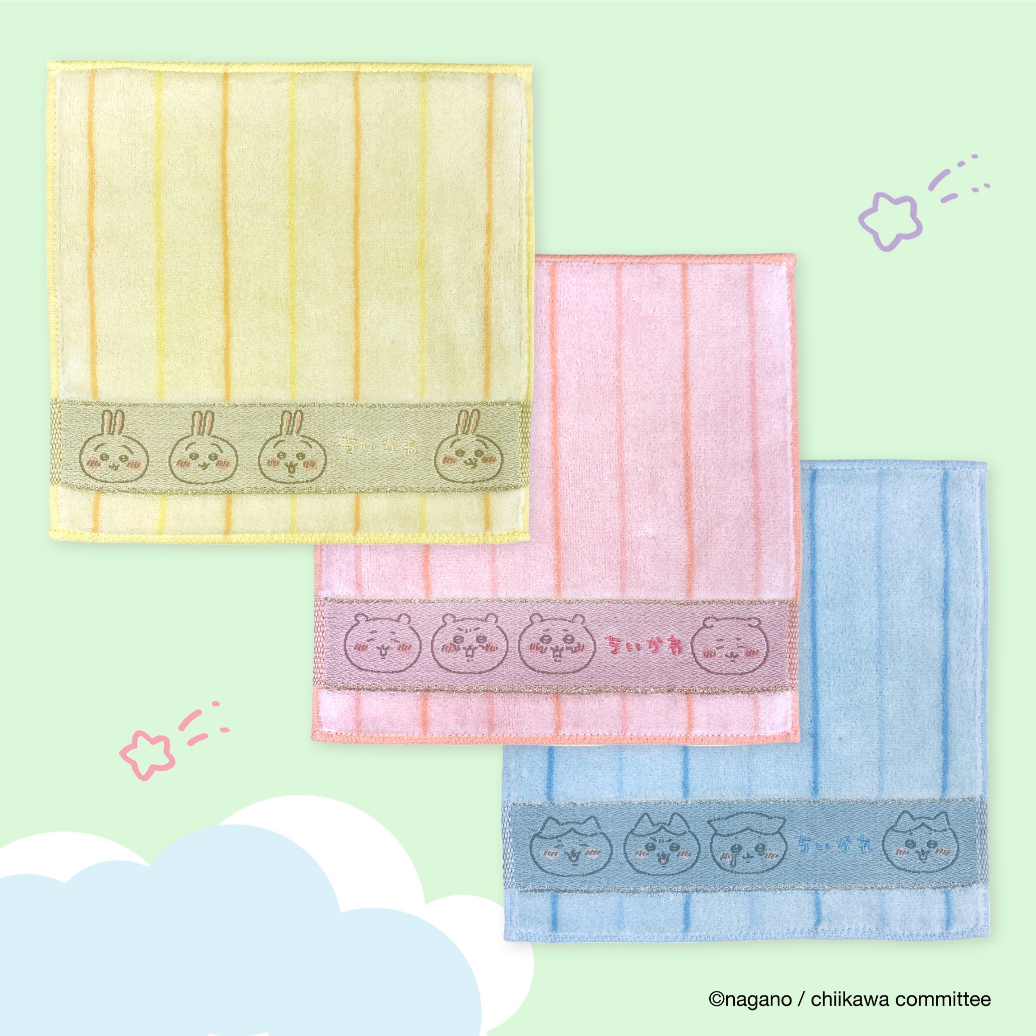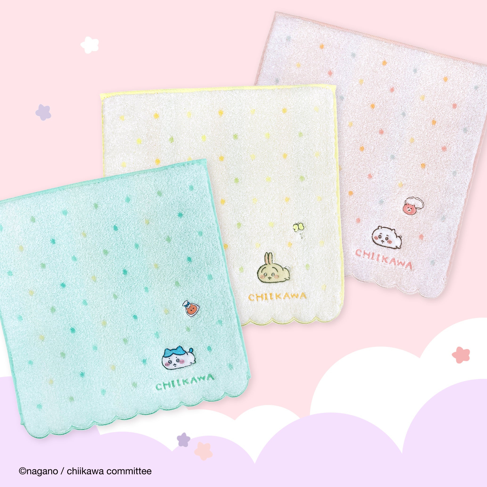 表情が楽しいちいかわやハチワレ、うさぎの顔が朱子部分に描かれたかわいいミニサイズのタオルハンカチ。