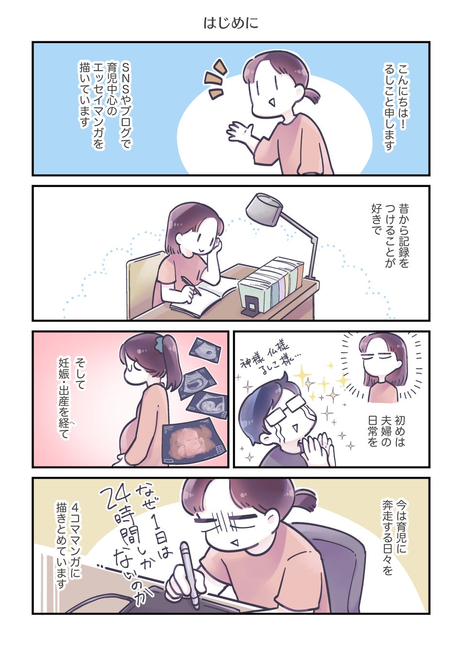 妊娠・出産の爆笑必至な悲喜こもごもを描いた「出会い→出産編!!」、ファンの間でも昔から人気のエピソードである、オンラインゲームが結んだふたりの出会いを描いた「ふたりの馴れ初め編!!」、いろいろな人の優しさを知った初育児を描いた「怒涛の出産直後編!!」の3編が収録されており、現在のSNSで更新中のドタバタ&キュートな投稿につながる半自伝的エッセイです。