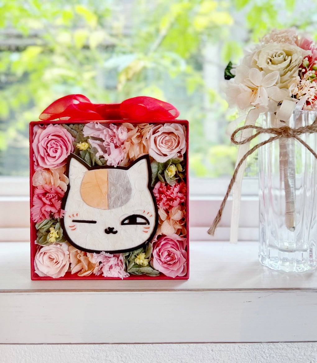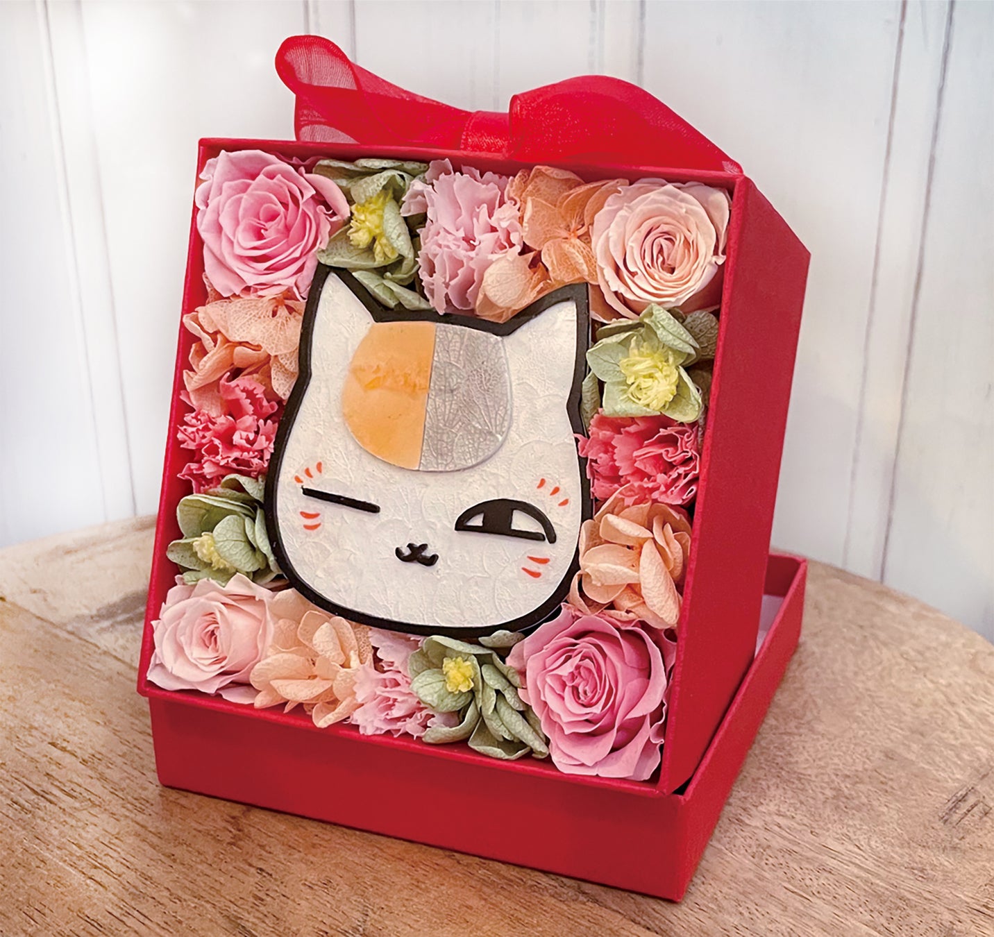 主人公・夏目貴志の用心棒をしながら家の飼い猫として一緒に暮らす人気キャラクター・ニャンコ先生をお花で描いたフラワーBOXは、テーブルや棚に飾っておくだけで元気づけてくれたり、いつでも心強く用心棒をしてくれそう。