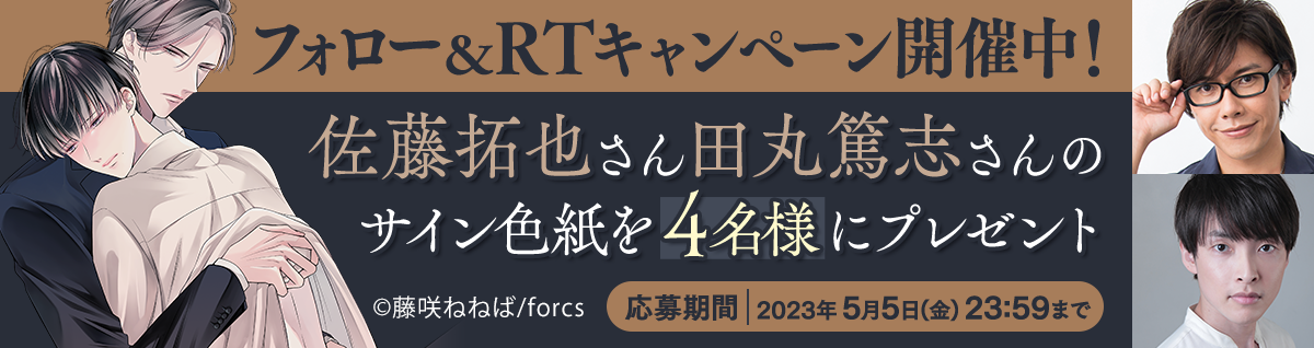 ボイスコミックの配信を記念して、佐藤拓也さん、田丸篤志さんのサイン色紙が抽選で4名様に当たるフォロー&RTキャンペーンを開催します。