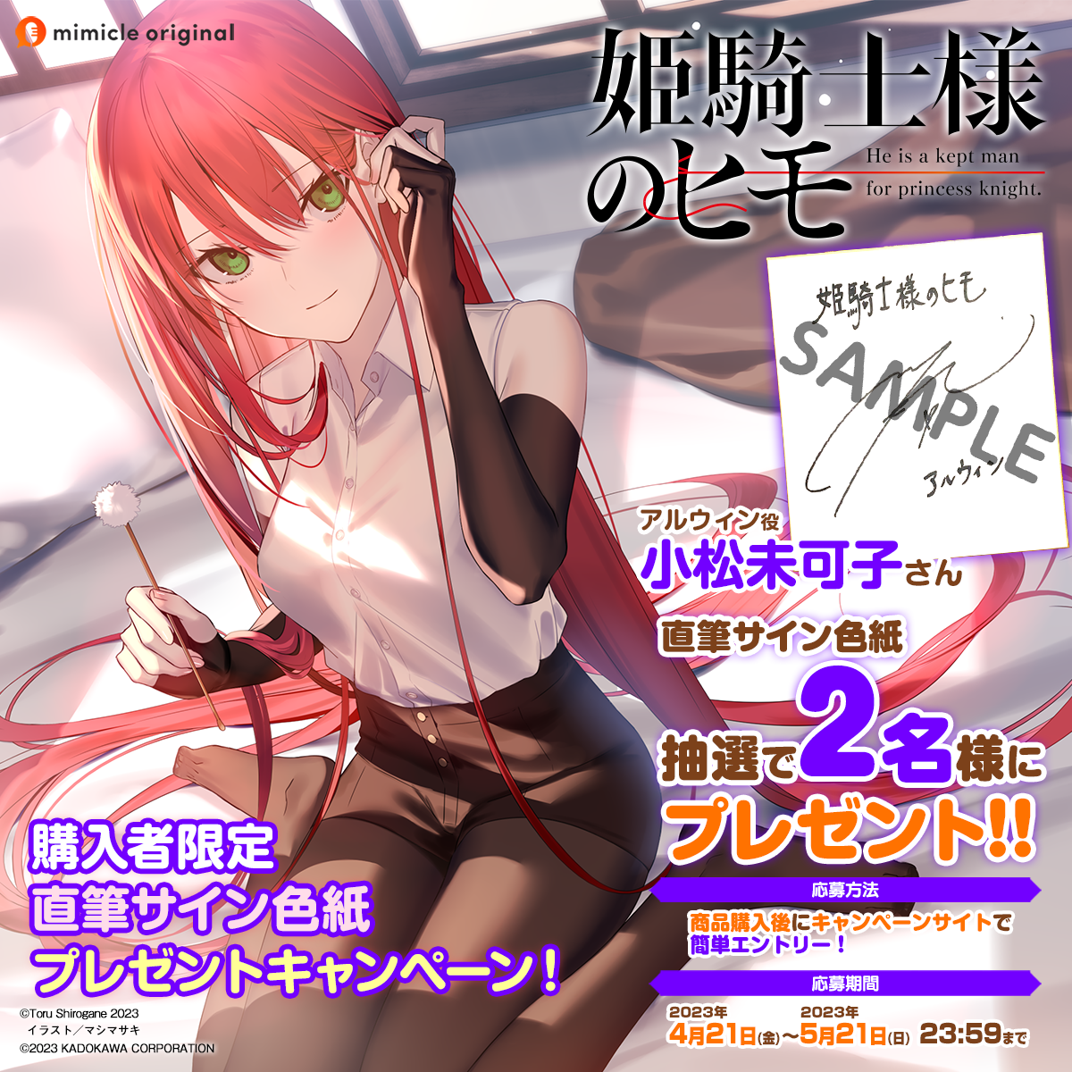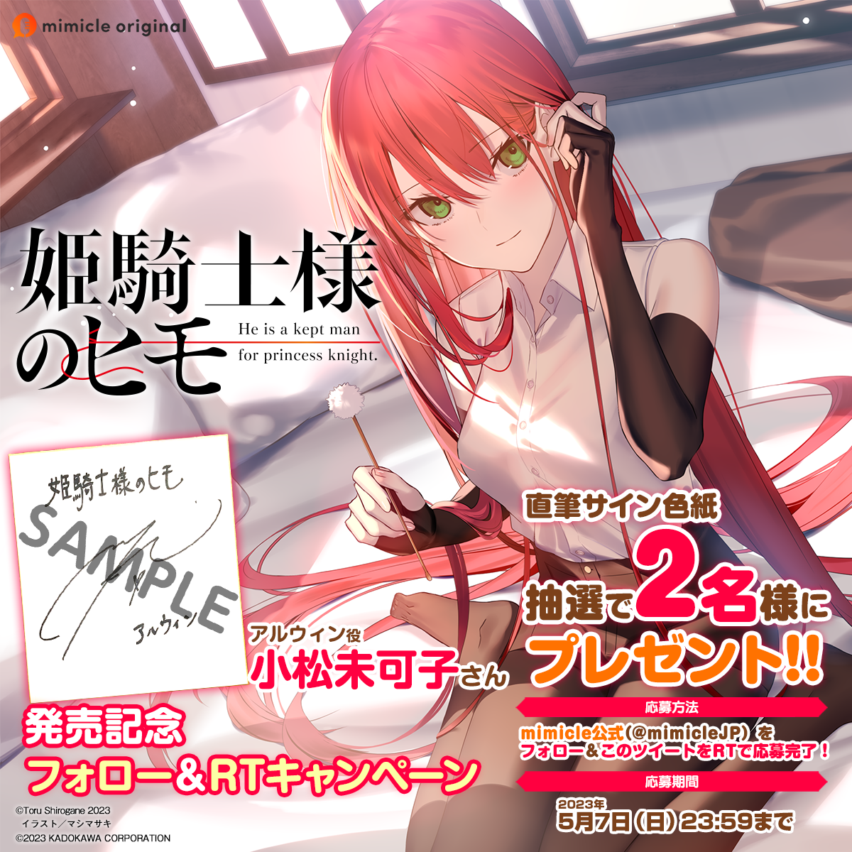 『姫騎士様のヒモ 姫騎士様に飼い慣らされるASMR』の発売を記念してフォロー&RTキャンペーンを開催。キャンペーン期間中にmimicle公式Twitter(@mimicleJP)をフォローしたうえでキャンペーンツイートをリツイートすれば応募完了となります。抽選で2名様に「アルウィン役 小松未可子さん直筆サイン色紙」をプレゼントいたします。