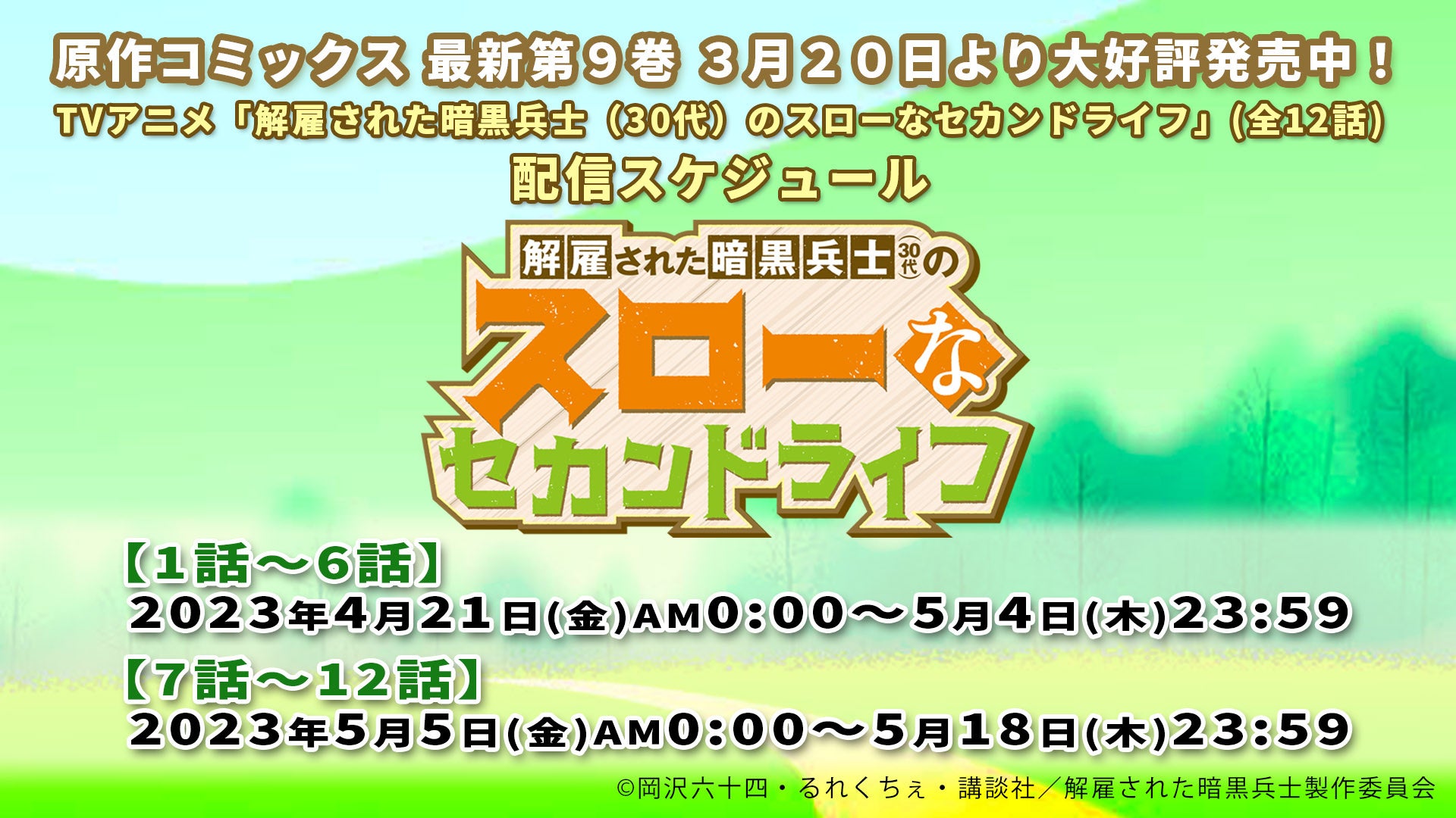 アニメ「「解雇された暗黒兵士(30代)のスローなセカンドライフ」 (全12話) 配信スケジュール