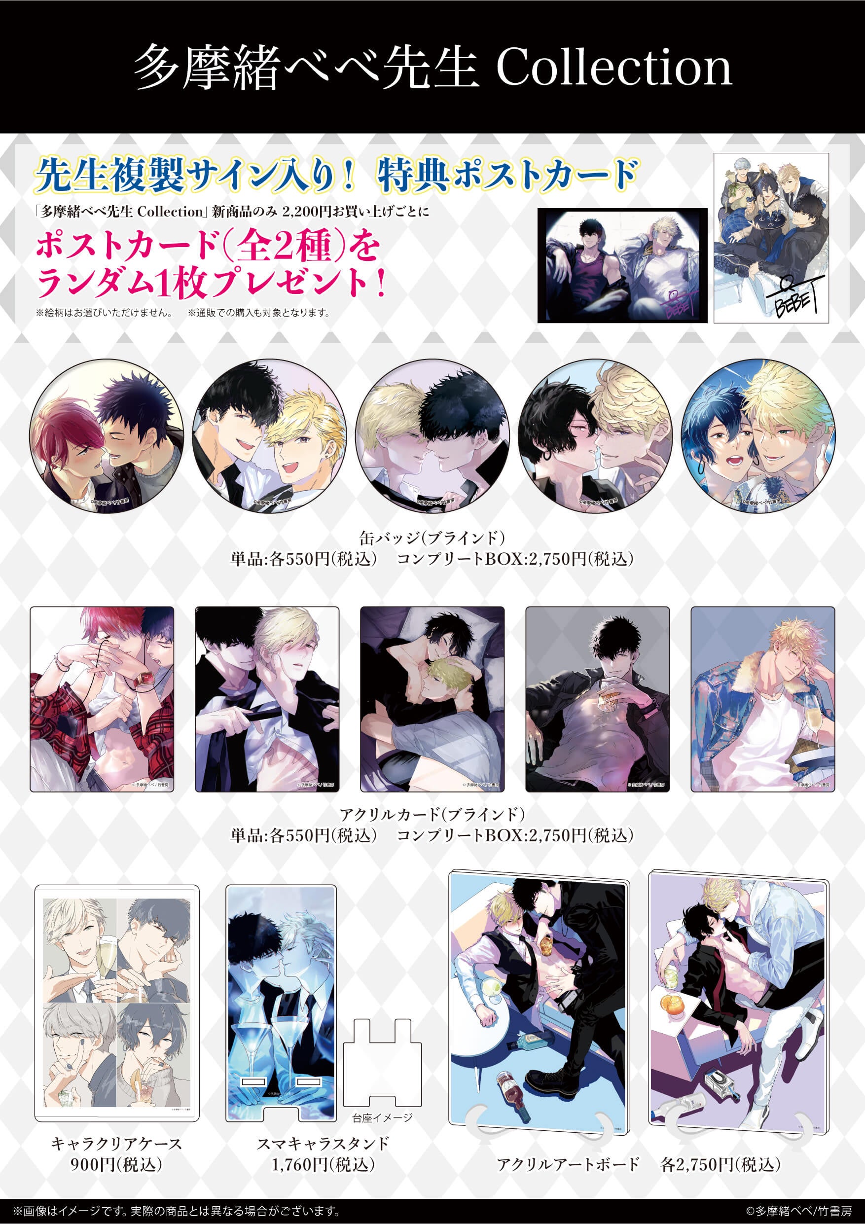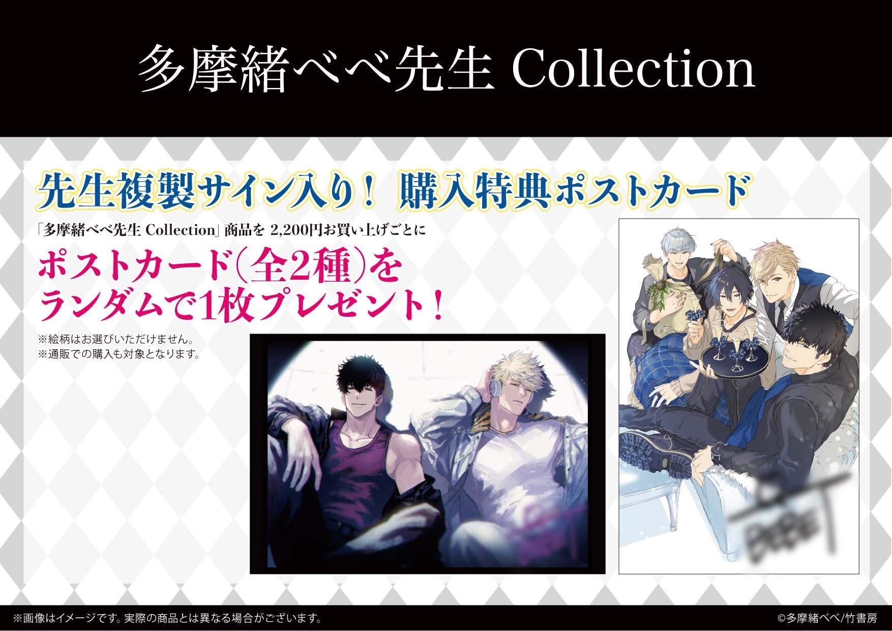 「多摩緒べべ先生 Collection」商品を1会計2,200円(税込)お買い上げごとに、購入特典ポストカード(全2種)をプレゼントしています。今回はなんと、べべ先生の複製サイン入りです!