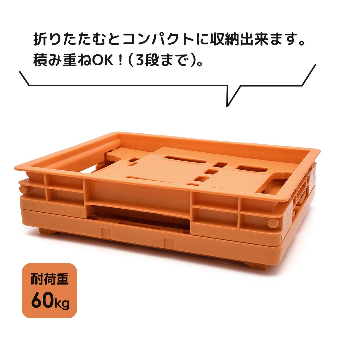 折りたたむとコンパクトに収納出来ます。積み重ねOK(3段まで)。耐荷重60kg!