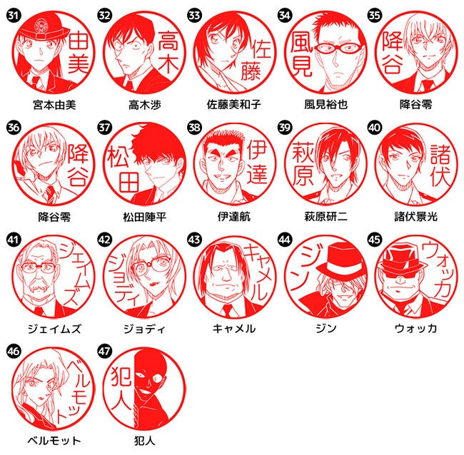 選べるキャラクターのイラストは全47種類。主人公の江戸川コナン、工藤新一をはじめ、灰原哀、怪盗キッド、赤井秀一、安室透などの第一弾(24種類・17キャラクター)から、小嶋元太、円谷光彦、吉田歩美、鈴木園子、降谷零、沖矢昴、羽田秀吉、犯人などが登場した第二弾(13種類・12キャラクター)に加えて、SNSよりリクエストをいただいた、妃英理、大岡紅葉、メアリー、伊達航、萩原研二、諸伏景光、ジェイムズ、ジョディ、キャメル、ウォッカの10キャラクターが第三弾として先日登場。各映画館のグッズ売り場ではこちらの47種類がすべてお選びいただけます。